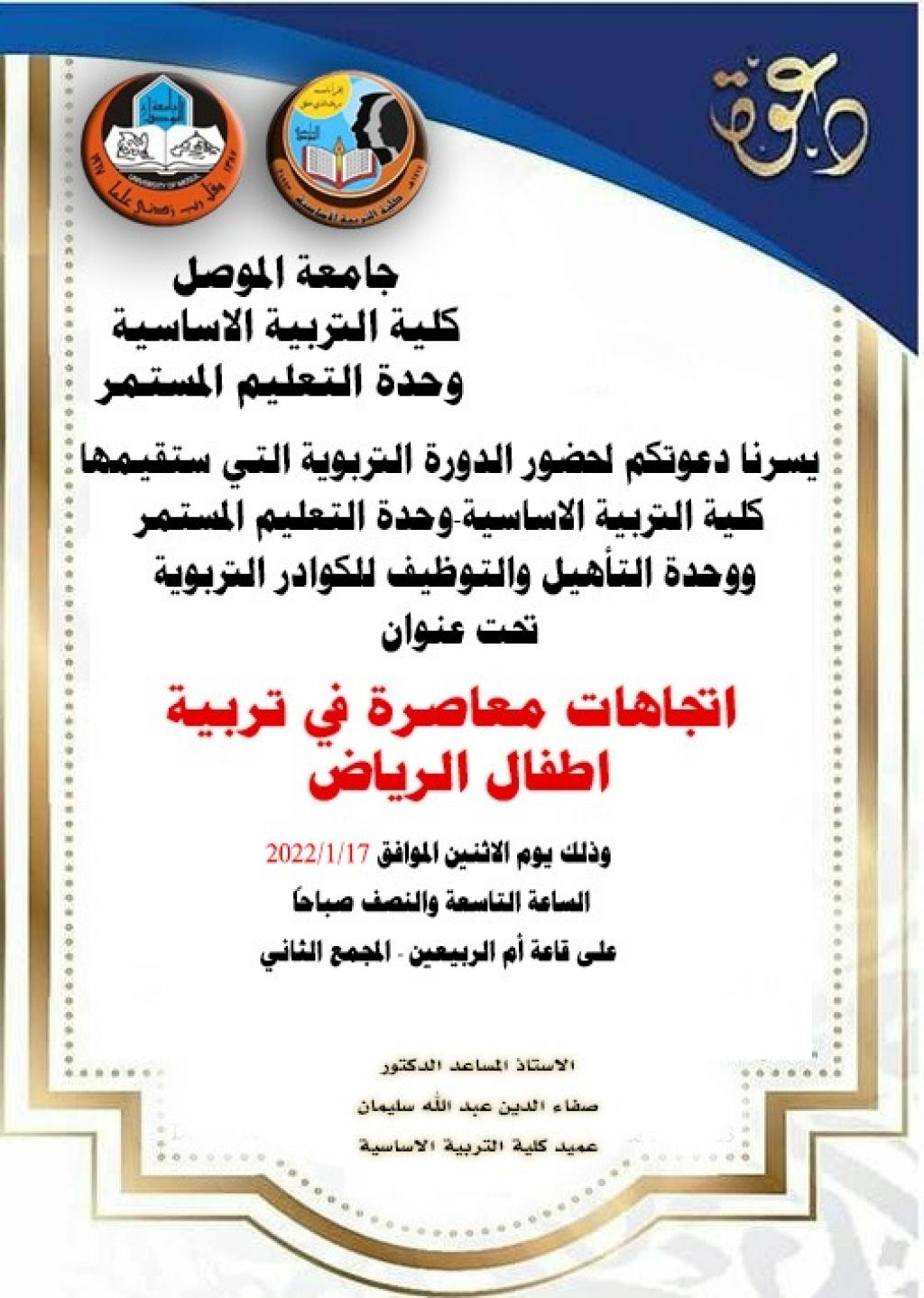 برعاية الأستاذ الدكتور قصي كمال الدين الاحمدي رئيس جامعة الموصل المحترم وبإشراف الأستاذ المساعد الدكتور صفاء الدين عبد الله سليمان عميد كلية التربية الأساسية المحترم تقيم وحدة التعليم المستمر بالتعاون مع وحدة التاهيل والتوظيف والمتابعة في كلية التربية الاساسية دورة تربوية حضورية للكوادر التربوية تحت عنوان ( اتجاهات معاصرة في تربية أطفال الرياض ) وذلك بالساعة التاسعة والنصف من صباح يوم الاثنين الموافق 17/1/2022 وفي قاعة ام الربيعين في الكلية .يمكنكم ملء معلواتكم في رابط الفورمة التالي https://docs.google.com/forms/d/e/1FAIpQLSfB4gq8v09W9S6hNTbSc1dHaNZWCqe_K83CJrgPUSxNkrQhSg/viewform