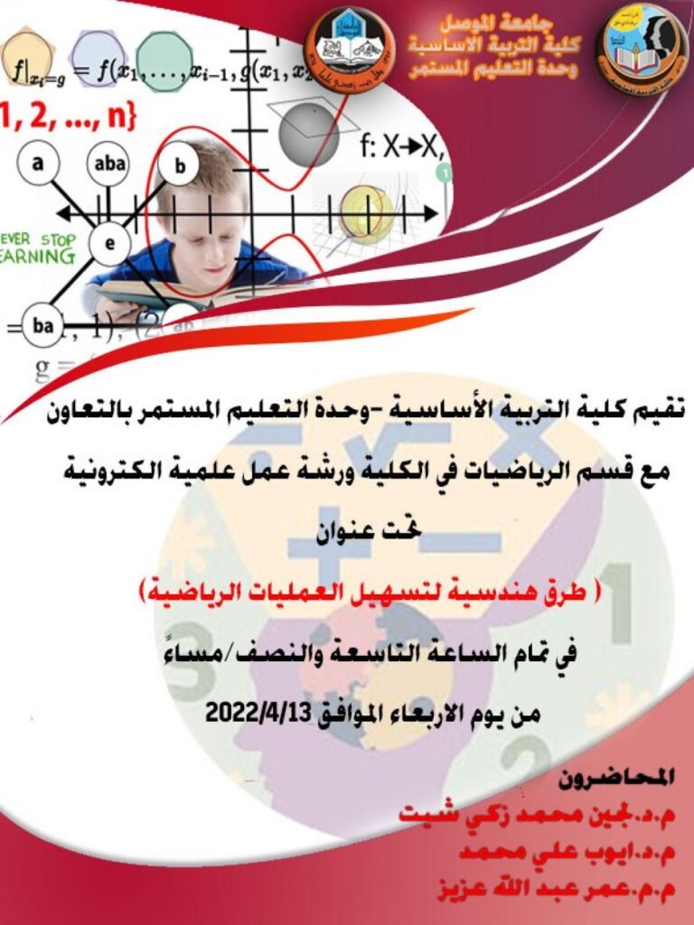 برعاية الأستاذ الدكتور قصي كمال الدين الاحمدي رئيس جامعة الموصل المحترم وبإشراف الأستاذ المساعد الدكتور صفاء الدين عبد الله سليمان عميد كلية التربية الأساسية المحترم تقيم وحدة التعليم المستمر في الكلية ورشة عمل علمية الكترونية بالتعاون مع قسم الرياضيات تحت عنوان ( كيفية كتابة بحوث التخرج) بالساعة التاسعة والنصف من مساء يوم الخميس الموافق 14/4/2022 وعلى رابط منصة Zoom الالكترونية التالي يحاضر فيها م.د. أسماء زياد الكاتب / م.د. محمود ضياء / م.م. سجى عثمان Join Zoom Meetinghttps://us06web.zoom.us/j/7341019935?pwd=b0pTTE9ZQkRaaDRCZjFrSlMzeUp1dz09Meeting ID: 734 101 9935Passcode: 123456