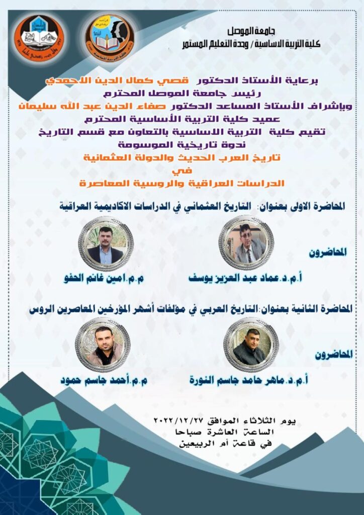 برعاية الأستاذ الدكتور قصي كمال الدين الاحمدي رئيس جامعة الموصل المحترم وبإشراف الأستاذ المساعد الدكتور صفاء الدين عبد الله سليمان عميد كلية التربية الأساسية المحترم تقيم وحدة التعليم المستمر بالتعاون مع قسم التاريخ في الكلية معرضاً للكتاب تحت عنوان ( رحلة كتاب) وذلك يوم الثلاثاء الموافق 27/12/2022 الساعة الحادية عشر صباحاً .