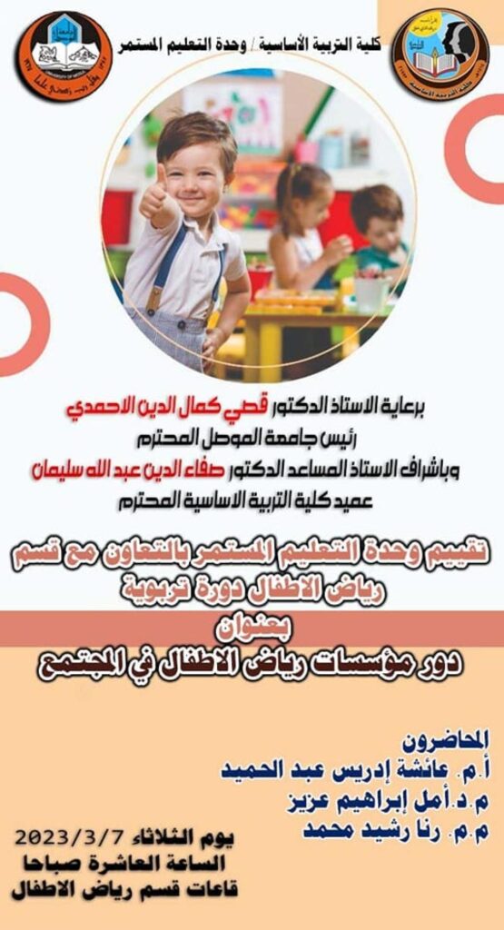 برعاية الأستاذ الدكتور قصي كمال الدين الاحمدي رئيس جامعة الموصل المحترم واشراف الأستاذ المساعد الدكتور صفاء الدين عبد الله سليمان عميد كلية التربية الأساسية المحترم تقيم وحدة التعليم المستمر بالتعاون مع قسم التاريخ دورة تاريخية بعنوان (علم التراث المخطوط) وذلك للايام من الثلاثاء – الاحد 7 – 12آذار 2023 في تمام الساعة الثانية عشر ظهراً وعلى قاعات قسم التاريخ.