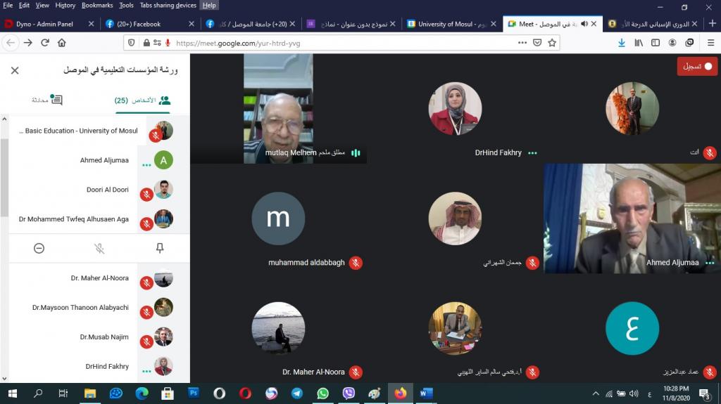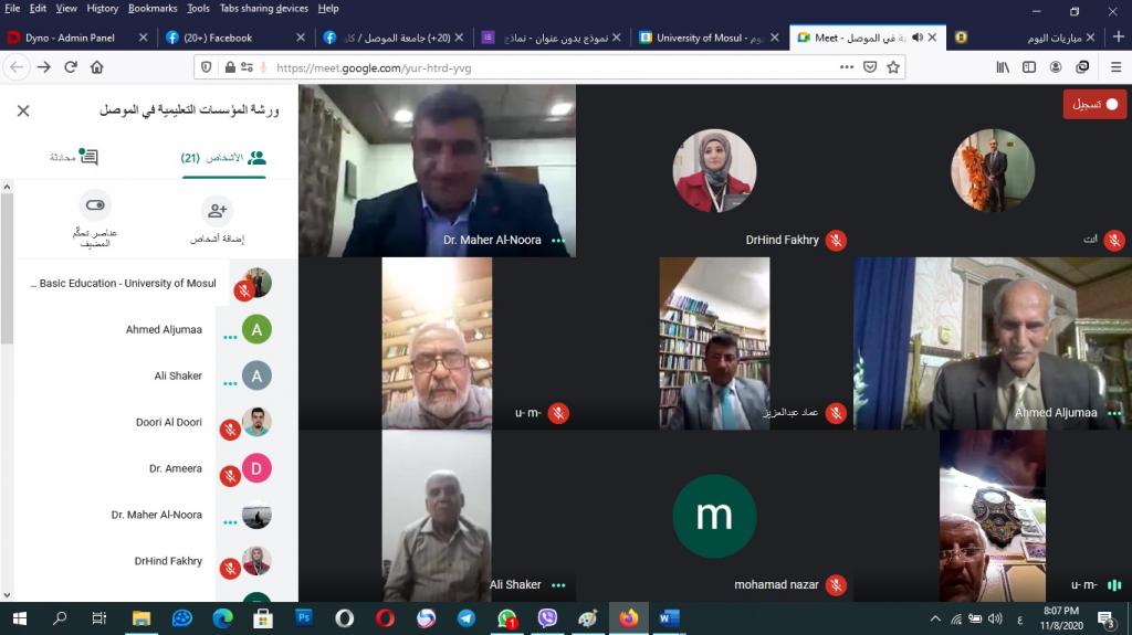 برعاية الأستاذ الدكتور قصي كمال الدين الأحمدي رئيس جامعة الموصل المحترم وبإشراف الأستاذ المساعد الدكتور صفاء الدين عبد الله سليمان عميد كلية التربية الأساسية المحترم أقامت -وحدة التعليم المستمر بالتعاون مع قسم التاريخ يوم الاحد الموافق 8/11/2020 وعبر الفضاء الالكتروني لمنصة Meet ورشة عمل تربوية تحت عنوان (المؤسسات التعليمية في الموصل من خلال الدراسات الاثارية والتاريخية) ، افتتحت الندوة بكلمة ترحيبية من السيد معاون العميد للشؤون العلمية الاستاذ الدكتور محمد توفيق عثمان آل حسين وايضاً للأستاذ الدكتور فتحي سالم حميدي اللهيبي رئيس قسم التاريخ رحب بها في جميع الحضور من الكلية وجامعة الموصل وجامعات القطر ومن المملكة العربية السعودية ومن دولة فلسطين وقدم الشكر لجميع القائمين على هذا النشاط العلمي التربوي ، بدأت الجلسة برئاسة الدكتورة هند فخري سعيد من قسم التاريخ قدمت فيها نبذة مختصرة عن الحضور وبدأت المحاضرة الاولى للاستاذ الدكتور احمد قاسم جمعة أستاذ الآثار والحضارة الإسلامية عنوان المحاضرة: المدارس الأثرية في مدينة الموصل بدأ التعليم مع خلق الإنسان شفهيا، وتلاه تحريريا بعد ابتكار الكتابة، وغدا من المتطلبات المهمة في الحضارة الإسلامية التي كانت الجوامع تنهض به. والمحاضرة الثانية كانت للاستاذ الدكتور علي شاكر علي/ أستاذ التاريخ العثماني عنوان المحاضرة: المناهج الدراسية والتعليمات الامتحانية في المدارس العثمانية في أواخر القرن19/ المدارس الرشدية :تنشد الدراسة متابعة طبيعة المناهج الدراسية في المدارس الرشدية من حيث قدرتها على ترجمة الفلسفة العامة للدولة العثمانية من صياغة الأهداف التربوية لكل مرحلة تعليمية و لا يمكن تحقيق تلك الأهداف من خلال المناهج الدراسية ،.م.د. محمد نزار الدباغ /جامعة الموصل /مركز دراسات الموصل عنوان المحاضرة: مدرسة جامع التوكندي في الموصل-معلم عمراني وتاريخي تزخر مدينة الموصل بالعديد من المعالم العمرانية ذات السمات الدينية وحديثنا هنا سيكون عن إحدى المدارس الملحقة بالجوامع في محاولة لإعطاء لمحة بسيطة عنه ، المحاضرة الرابعة كانت أ.م.د. ماهر حامد جاسم النورة عنوان المحاضرة الأوضاع التعليمية في الموصل منذ أواخر القرن التاسع عشر حتى عهد الانتداب البريطاني 1920م كانت أوضاع التعليم في العراق بشكل عام وفي الموصل بشكل خاص محرومة من التجديد واقتصرت الدراسة في بادئ الأمر على الجوامع والتكايا ، وكان التدريس في هذه المراكز مستمراً على حاله دون تغيير منذ العصر العباسي ، وفي الختام قرأ الاستاذ الدكتور فتحي سالم حميدي رئيس قسم التاريخ توصيات الورشة .