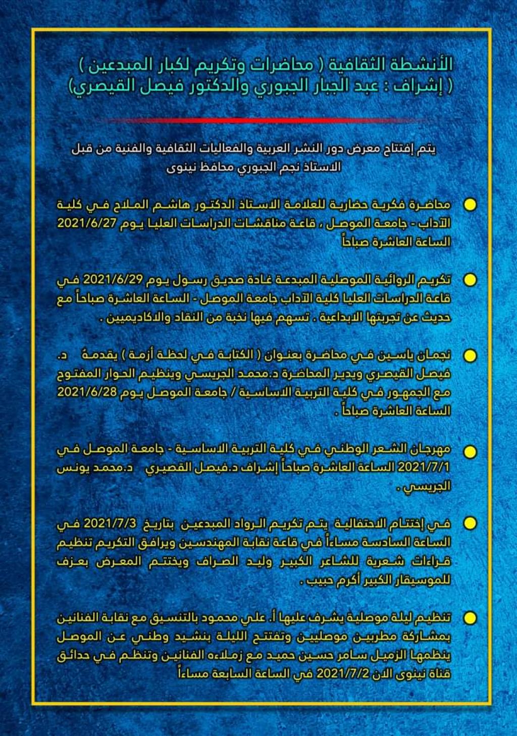 برعاية الأستاذ الدكتور قصي كمال الدين الاحمدي رئيس جامعة الموصل المحترم وبإشراف الأستاذ المساعد الدكتور صفاء الدين عبد الله سليمان عميد كلية التربية الأساسية المحترم تقيم وحدة التعليم المستمر وضمن الأنشطة الثقافية المرافقة لمعرض نينوى الدولي للكتاب بالساعة العاشرة صباحا من يوم الاثنين 28/6 وعلى قاعة ام الربيعين محاضرة بعنوان ( الكتابة في لحظة ازمة ) للدكتور نجمان ياسين. يقدمه الدكتور فيصل القصيري. ويدير المحاضرة الأستاذ المساعد الدكتور محمد يونس صالح الجريسي . وعلى هامش المحاضرة يقام ( مهرجان الشعر الوطني ) .