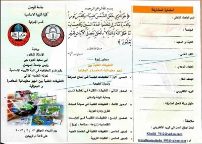يقيم قسم الجغرافية في كلية التربية الاساسية ندوته العلمية الاولى ( التطبيقات التقنية بين الجيو معلوماتية المعاصرة والجغرافية ) وذلك يوم الاربعاء الموافق 13/3/2013 وعلى قاعة ام الربيعين في الكلية .وللاطلاع على التفاصيل من خلال الفولدر