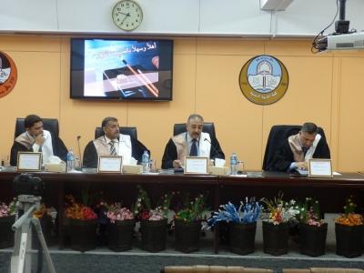 جرت في قاعة ام الربيعين في كلية التربية الاساسية يوم الاحد الموافق 3/ 11/ 2013 مناقشة طالب الماجستير محمد يقظان صالح عن رسالته الموسومة" اثر تمارين السلالم في عدد من المتغيرات البدنية والقدرات المهارية والعقلية لدى لاعبي كرة قدم الصالات "بإشراف ا.د. معتز يونس ذنون