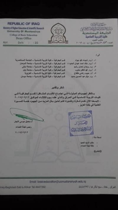 تم ايفاد أ.م.د خالد احد عيدان من قسم الجغرافية في كليتنا الى بغداد لحضور اجتماع رؤساء اقسام الجغرافية لكليات التربية الاساسية في العراق وذلك ايام الاحد والاثنين والثلاثاء والاربعاء 10- 11 – 12 – 13 /12 /2017 . وتم تكريم الحضور بكتاب شكر من قبل رئيس لجنة العمداء في الجامعة المستنصرية .