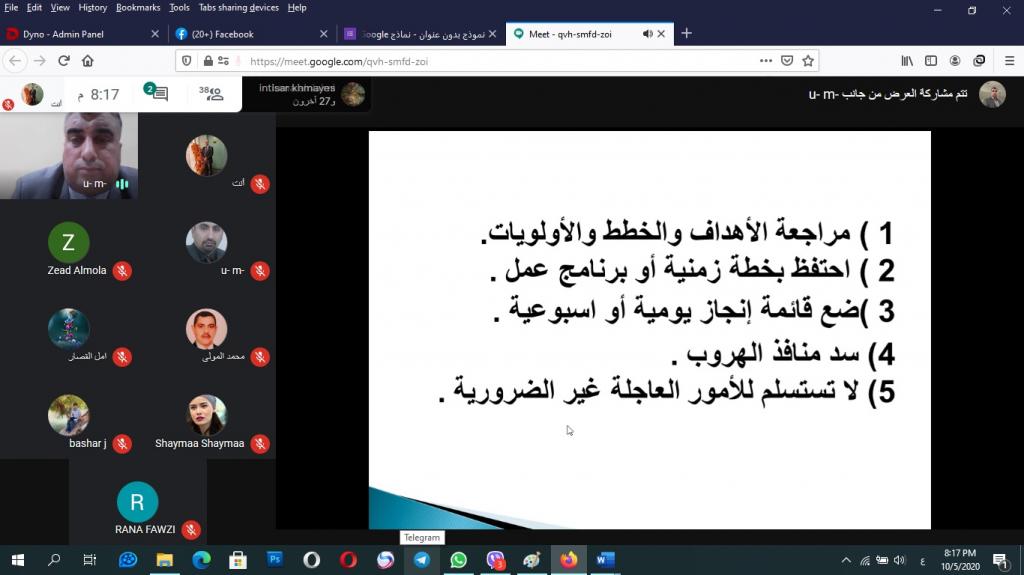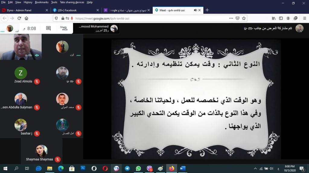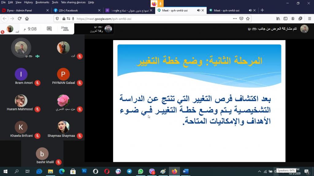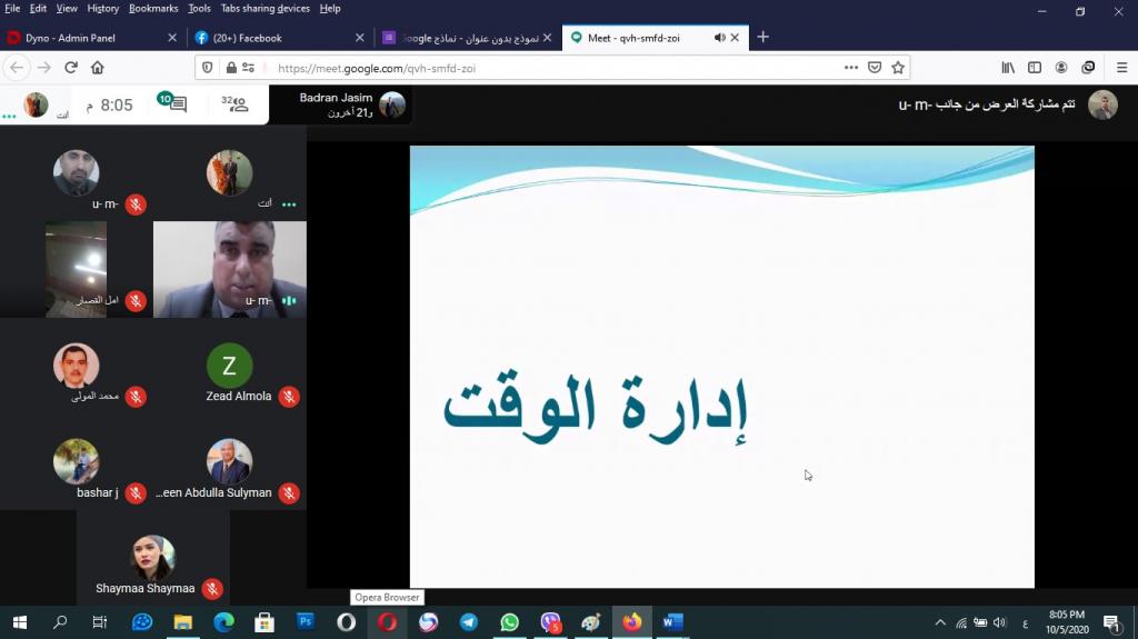 وبإشراف السيد عميد كلية التربية الاساسية الاستاذ المساعد الدكتور صفاء الدين عبد الله سليمان المحترم أقام قسم التربية الخاصة في كلية التربية الأساسية اليوم الثاني والاخير من الدورة التدريبية العلمية تحت عنوان ( المؤسسات التعليمية بين الادارة والقيادة ) والتي استمرت يومي الاحد والاثنين الموافق 4 – 5 / 10/2020 ، وحاضر فيها الأستاذ المساعد الدكتور فتحي طه مشعل الجبوري رئيس قسم التربية الخاصة وعبر الفضاء الالكتروني لمنصة ( Meet ) الافتراضية . تناولت الدورة التدريبية في يومها الثاني محاضرات للدكتور فتحي طه مشعل رئيس قسم التربية الخاصة في الكلية بعنوان ( القيادة الادارية ) تضمنت موضوعات انواع القيادة الادارية اشتملت على إدارة الوقت والادارة الناجحة للوقت ومضيعات الوقت ثم نشاط عملي عن كيفية تنظيم الوقت، بعدها تم الانتقال إلى ادارة المعرفة ومتطلباتها ونشاط حولها ، بعدها تم الحديث عن ادارة الاداء واهميتها في المؤسسات التعليمية ثم نشاط عملي عن الموضوع ، وتم الانتقال بعد ذلك الى إدارة التغيير ومراحل عملية التغيير ، وتقديم نشاط عملي عن كيفية التغيير. حيث تم التفاعل بشكل كبير من قبل المشاركين الذين قدموا ثناءاً كبيراً ورضا عن المحاضرة ، وتم فتح باب المداخلات والاسئلة والمشاركات .