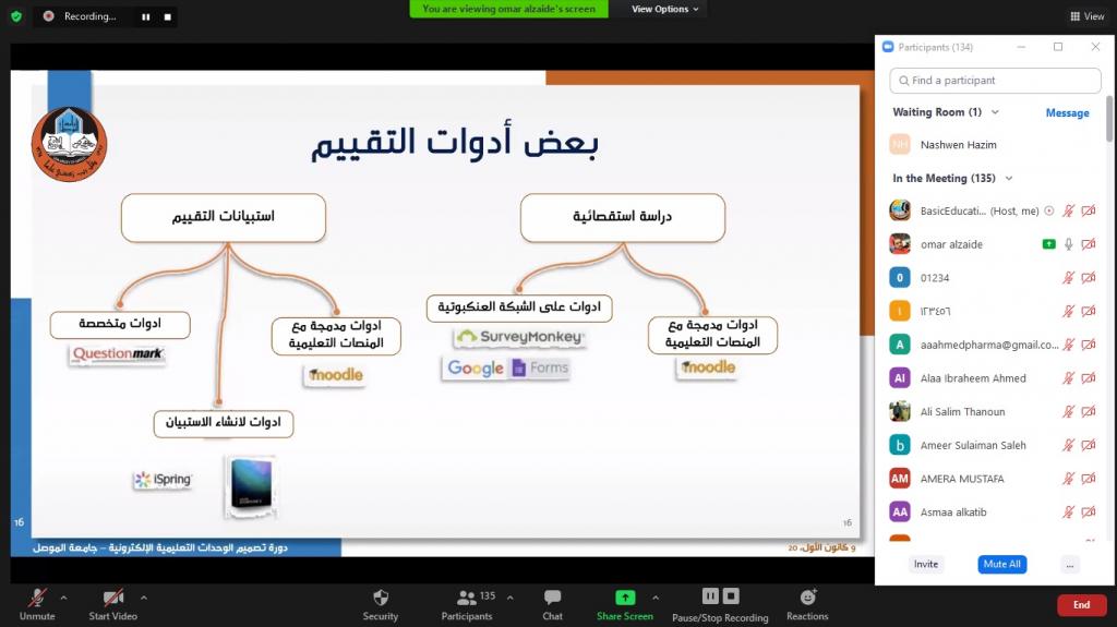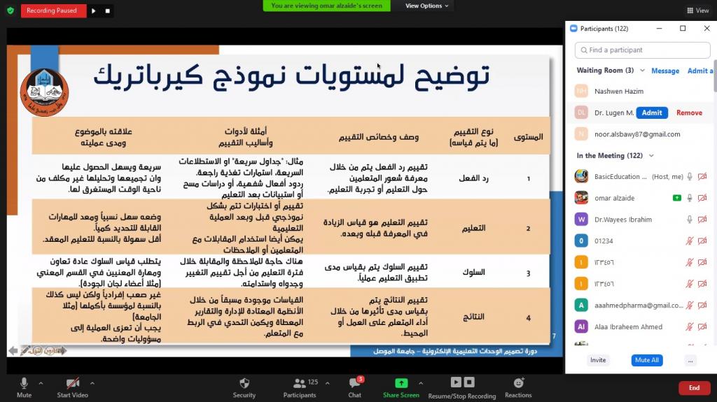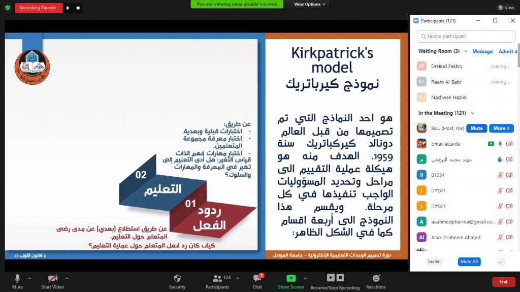 بإشراف وحضور الاستاذ المساعد الدكتور صفاء الدين عبد الله سليمان عميد كلية التربية الاساسية تم في يوم الاربعاء الموافق 9/12/2020 إقامة المحاضرة الاخيرة من دورة المحتوى الرقمي الافتراضية التي قدمها الدكتور عمر احمد ابراهيم من مركز الحاسبة تناولت المحاضرة شرح مبسط لنموذج لعملية تقييم المحاضرات من خلال نموذج كيرباتريك وايضا توضيح مستويات هذا النموذج والتحليل التتبعي والتقييم الرسمي له والهدف منها و تبيان الاسس الرئيسية للتدريسيين عن كيفية تقيم المحاضرات المعطى للمتلقي مثل رد الفعل والتعليم والسلوك والنتائج ، وحضر المحاضرة التي جرت عبر منصة Zoom الالكترونية جميع تدريسيي كلية التربية الاساسية الذين تفاعلوا كثيراً مع المحاضر من خلال الاستفسارات والتساؤلات والمداخلات العلمية للمحاضرة وشكروا الدكتور عمر على هذه المعلومات القيمة والمفيدة للجميع التي تلقوها في هذه الدورة .