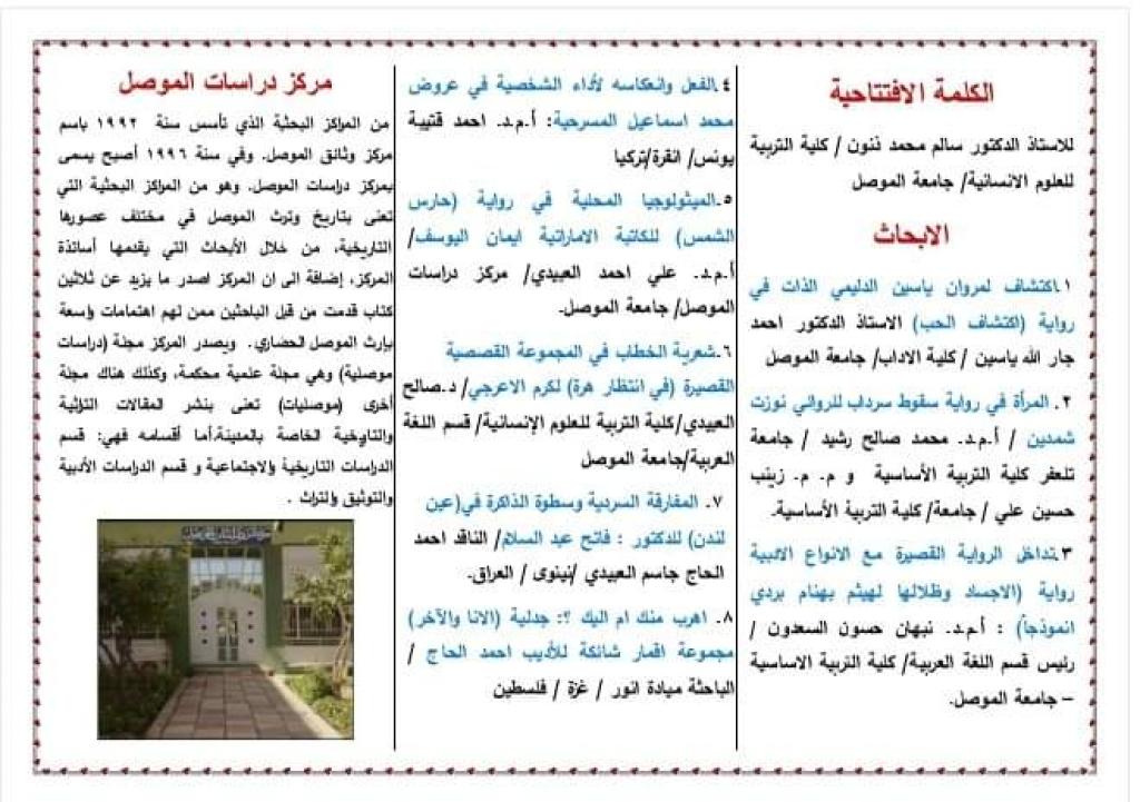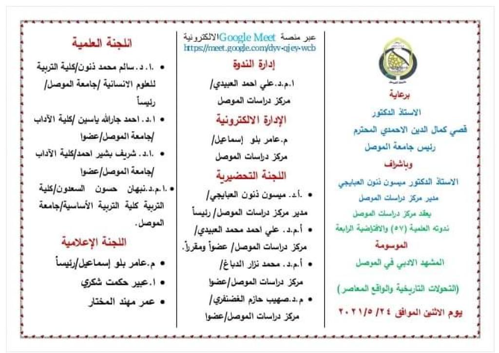 مشاركة أ.م.د. نبهان حسون السعدون رئيس قسم اللغة العربية في عضوية اللجنة العلمية للندوة العلمية لمركز دراسات الموصل