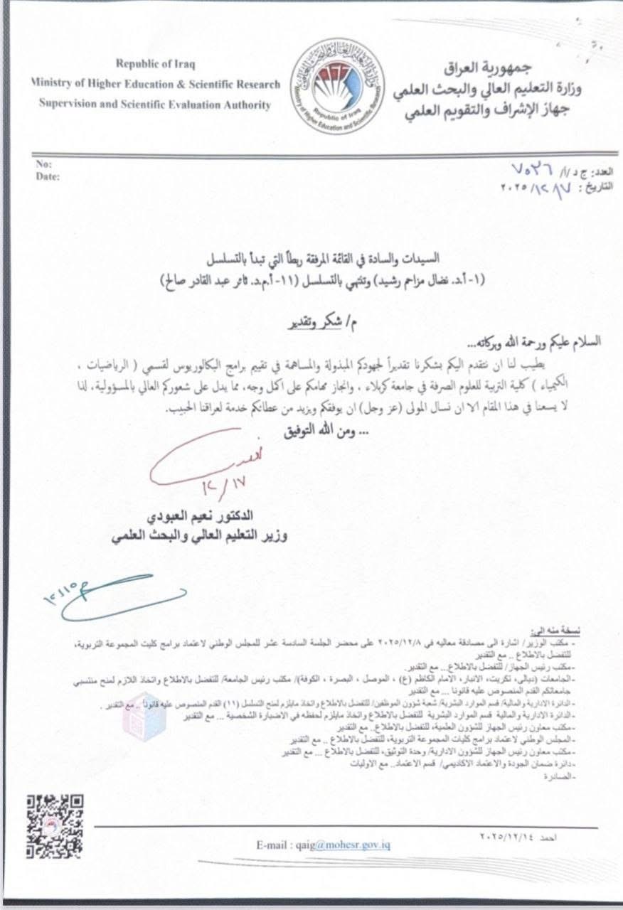 basiceducation2025-12-18T22:16:07+03:00وجه السيد معالي وزير التعليم العالي والبحث العلمي كتاب شكر وتقدير للأستاذ الدكتور فتحي طه مشعل الجبوري التدريسي في كليتنا وعضو المجلس الوطني لاعتماد برامج كليات المجموعة التربوية في العراق تقديرا لجهوده المبذولة في تقييم أقسام الكليات التربوية في الجامعات العراقية والتي قدمت بطلب الاعتماد البرامجي الى المجلس الوطني لاعتماد برامج كليات المجموعة التربوية.