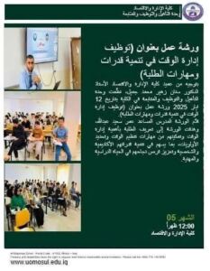 وحدة التأهيل والتوظيف والمتابعة في كلية الإدارة والاقتصاد تقيم ورشة عمل بعنوان (توظيف ادارة الوقت في تنمية قدرات ومهارات الطلبة)
