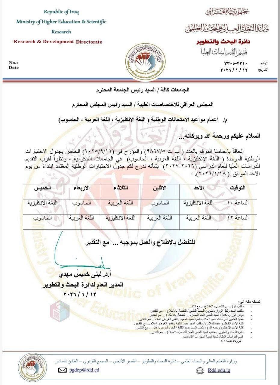 تعلن وزارة التعليم العالي والبحث العلمي / دائرة البحث والتطوير، وبالتزامن مع قرب موعد التقديم للدراسات العليا للعام الدراسي 2026-2027، عن جدول مواعيد الاختبارات الوطنية [إقرأ المزيد]