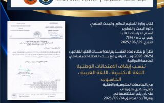 كتاب وزارة التعليم العالي والبحث العلمي دائرة البحث والتطوير قسم الدراسات العليا رقم : ب ت ه / 7374 التاريخ: 29 / 06 / 2025 نظراً لإ نتهاء مدة التقديم للدراسات العليا للعامين (2024-2026) وبالتزامن [إقرأ المزيد]