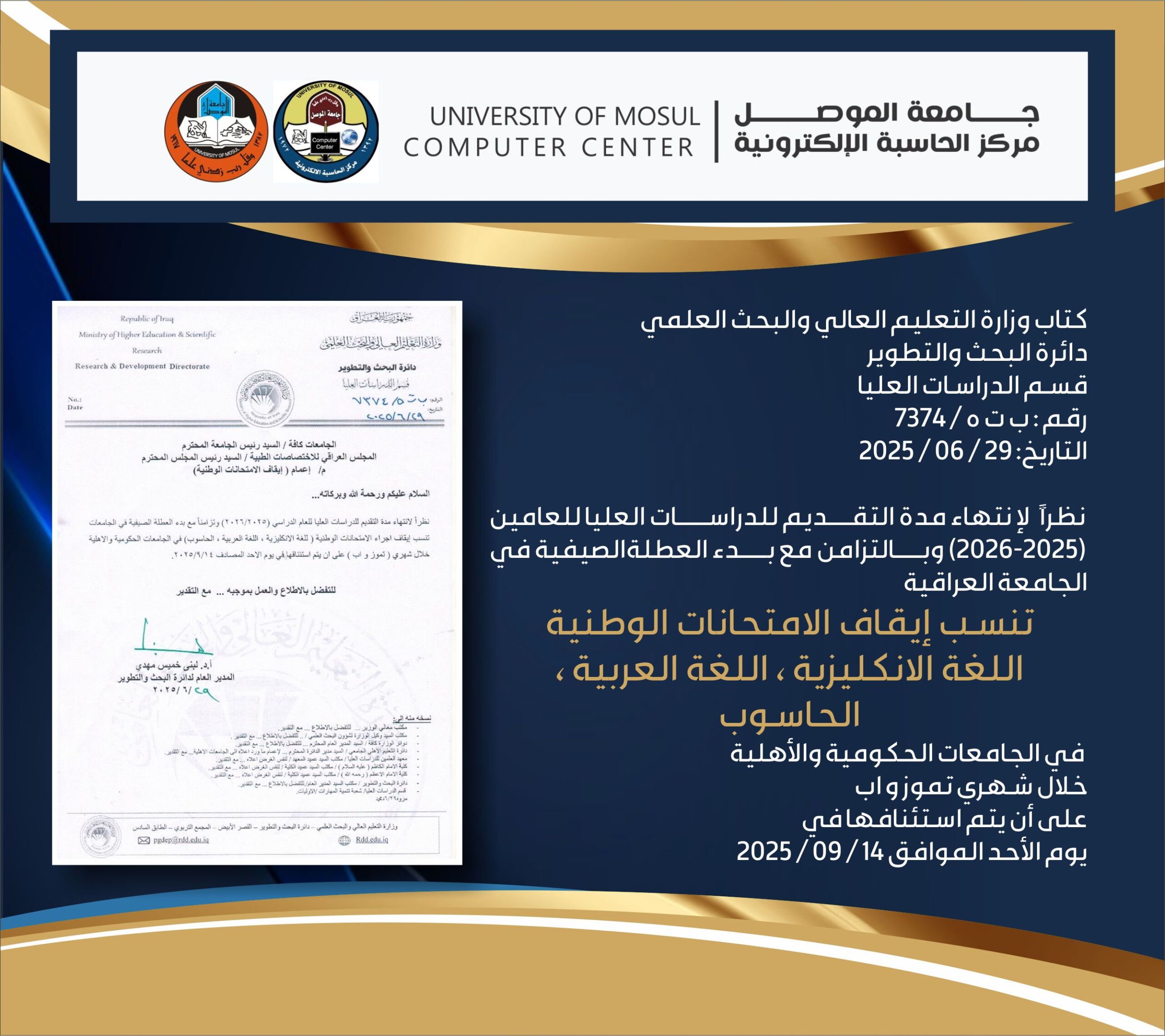 إيقاف الامتحانات الوطنية ( اللغة الانكليزية ، اللغة العربية ، الحاسوب)