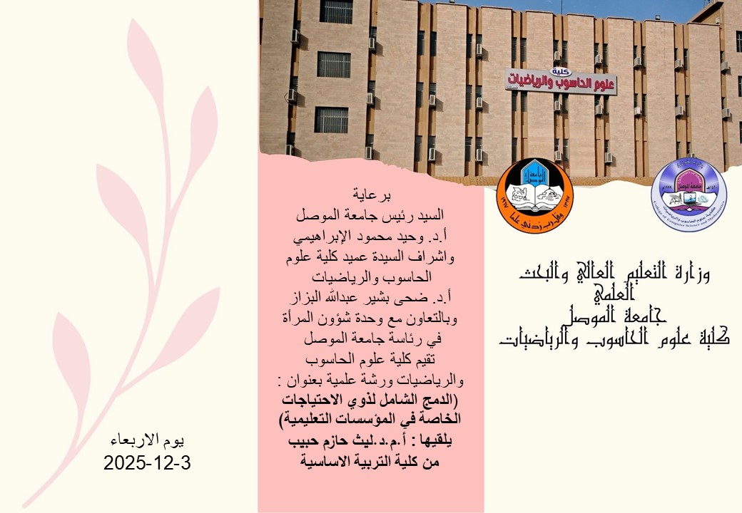 جاء استحداث كلية علوم الحاسوب والرياضيات في جامعة الموصل تواصلا مع ثورة المعلوماتية الهائلة التي اجتاحت العالم ولقد سارت هذه الكلية ومازالت بخطى واسعة نحو التحديث المستمر من اجل وضع المعلومة في متناول الجميع وتهيئة خريجيها للعمل في مؤسسات الدولة وهم على حافات تخصصاتهم العلمية مزودين بكم وفير من المعلومات الخاصة بأنظمة الحاسبات وبرمجياتها وامكانيات التطبيق ضمانا للسرعة والدقة في الحصول على البيانات والنتائج. لقد كان تأسيس الكلية في 28-7-1999 وبثلاثة أقسام وهي علوم الحاسوب والرياضيات والاحصاء ,والحاقا بالتخصصات العلمية تم افتتاح قسم البرمجيات في العام 2002 وفي العام 2010 تم افتتاح قسم بحوث العمليات والتقنيات الذكائية وهو القسم الأول بهذا التخصص على مستوى الجامعات العراقية الحكومية. إقرأ المزيد