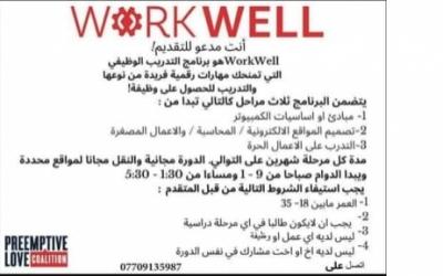 ندعوكم للتسجيل والاستفادة من الدورات المقدمة بالتعاون مع منظمة PLC. تعلن منظمة Preemptive love coalition عن بدء التسجيل في برنامج التدريب الوظيفي Work Well . يتضمن البرنامج تدريـس لغة الانكليزية واساسيات الحاسوب للطلبة الخريجين لكلا الجنسين. علما ان البرنامج متوفر في اربع محافظات هي اربيل – سليمانية – دهوك – الموصل تنتهي فترة التقديم 25/ 5 /٢٠١٩. عنوان البرنامج في مدينة الموصل سايدين حي الشرطة مجاور كماليات عرفات للسيارات رقم تلفون البرنامج في اربيل 07518476679 رقم تلفون البرنامج في السليمانية 07722242395 رقم تلفون البرنامج في دهوك 07514022789 رقم تلفون البرنامج في الموصل 07709135987