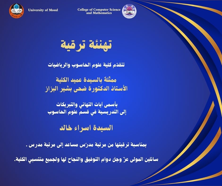 ترقية علمية للتدريسية (السيدة اسراء خالد احمد ) في كلية علوم الحاسوب والرياضيات من مرتبة مدرس مساعد الى مرتبة مدرس اعتباراً من 25/3/2025