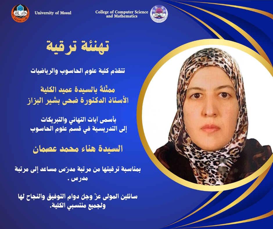 ترقية علمية للتدريسية (السيدة هناء محمد عصمان ) في كلية علوم الحاسوب والرياضيات من مرتبة مدرس مساعد الى مرتبة مدرس اعتباراً من26/5/2025