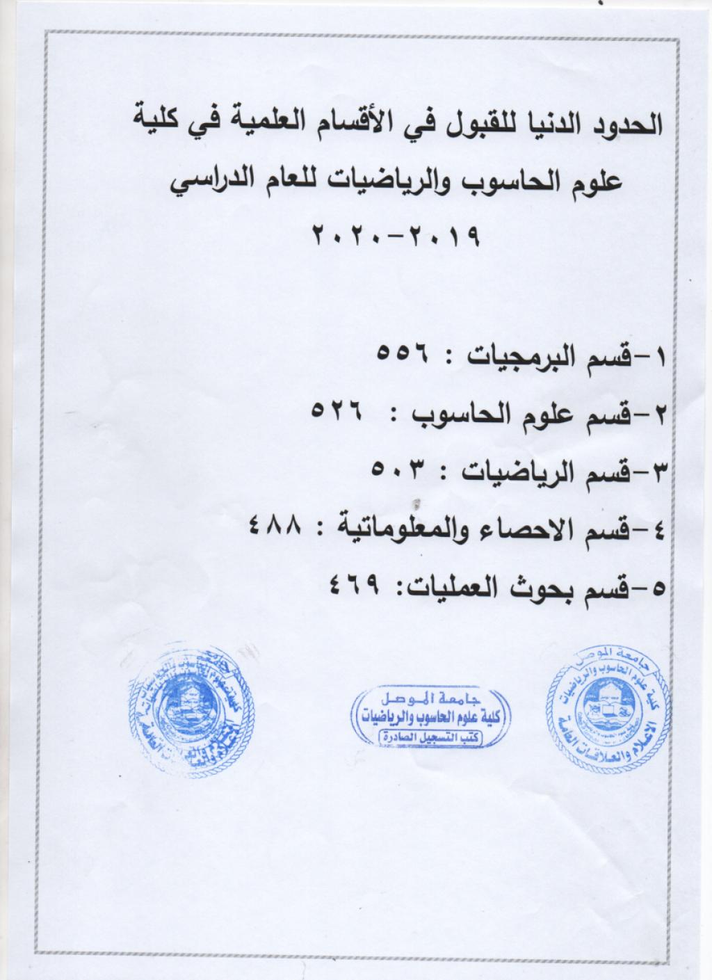 طلبة المرحلة الاولى المقبولين الجدد للعام الدراسي 2019-2020 فيما يلي الحدود الدنيا للاقسام العلمية في كليتنا والتي تم توزيعكم على اساسها علما انه سوف يتم بدأ التسجيل من يوم الاثنين الموافق 14-10-2019 في عمادة الكلية