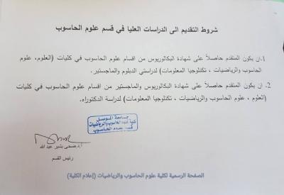 بعد ورود العديد من الاستفسارات والاسئلة لنا حول الية شمول المتقدمين للدراسات العليا في قسم علوم الحاسوب في كليتنا، قام السيد رئيس قسم علوم الحاسوب (أ. د ضحى بشير عبدالله) بتوضيح الألية للمشمولين بالتقديم من خلال الاعلان ادناه