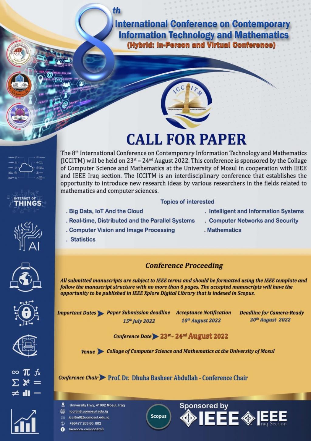 برعاية السيد معالي وزير التعليم العالي والبحث العلمي الاستاذ الدكتور نبيل كاظم عبد الصاحب المحترموبإشراف السيد رئيس جامعة الموصل الاستاذ الدكتور قصي كمال الدين الاحمدي المحترمواشراف ومتابعة الاستاذ الدكتور ضحى بشير عبدالله المحترمة – عميد كلية علوم الحاسوب والرياضيات (رئيس المؤتمر)تقييم كلية علوم الحاسوب والرياضيات في جامعة الموصل وبالتعاون مع مؤسسة IEEE، و قسم العراق IEEE مؤتمرها العلمي الدولي الثامن في علوم الحاسوب والرياضيات والموسوم:”المؤتمر الدولي الثامن لتكنولوجيا المعلومات المعاصرة والرياضيات “للفترة من 23-24 آب 2022.يتم استلام البحوث والمشاركات العلمية وفقا للمحاور التالية:1: البيانات الضخمة وإنترنت الأشياء والحوسبة السحابية2: أنظمة المعلومات الذكية3: أنظمة الوقت الحقيقي والانظمة الموزعة والمعالجة المتوازية4: شبكات الحاسوب وامنية المعلومات5: الرؤية الحاسوبية ومعالجة الصور6: الرياضيات7: الإحصاءعلما ان البحوث المقبولة والمقدمة سيتم نشرها في قاعدة بيانات أبحاث IEEE Xplore كما وسيتخلل المؤتمر منتدى للباحثين والعلماء المهتمين في مجال التكنولوجيا والرياضيات والاحصاء لتقديم ومناقشة احدث نتائج بحوثهم وأوراقهم العلمية.مواعيد مهمة :الموعد النهائي لاستلام البحوث: 15 تموز 2022اشعار القبول : 10 آب 2022تقديم الصيغة النهائية : 20 آب 2022تاريخ انعقاد المؤتمر: 23-24 آب 2022للمزيد من المعلومات يرجى زيارة موقع المؤتمر:https://iccitm8.uomosul.edu.iqاو مراسلتنا على البريد الالكتروني :[email protected]مع خالص الامنيات والتوفيق