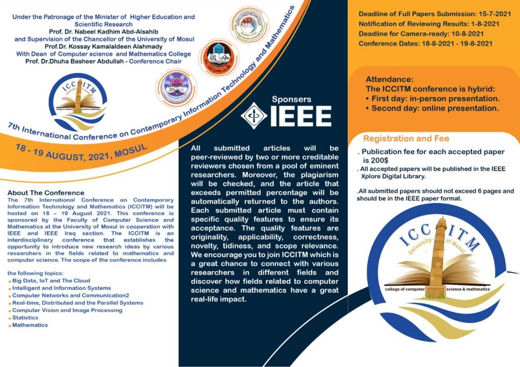 برعاية السيد معالي وزير التعليم العالي والبحث العلمي الاستاذ الدكتور نبيل كاظم عبد الصاحب المحترم وباشراف السيد رئيس جامعة الموصل الاستاذ الدكتور قصي كمال الدين الاحمدي المحترمواشراف ومتابعة الاستاذ الدكتور ضحى بشير عبدالله المحترمةعميد كلية علوم الحاسوب والرياضيات (رئيس المؤتمر)تقييم كلية علوم الحاسوب والرياضيات في جامعة الموصل وبالتعاون مع مؤسسة IEEE، مؤتمرها العلمي الدولي السابع في علوم الحاسوب والرياضيات والموسوم:”المؤتمر الدولي السابع لتكنولوجيا المعلومات المعاصرة والرياضيات “للفترة من 18-19/8/2021.يتم استلام البحوث والمشاركات العلمية وفقا للمحاور التالية:1: البيانات الضخمة وإنترنت الأشياء والحوسبة السحابية2: أنظمة المعلومات الذكية3: أنظمة الوقت الحقيقي والانظمة الموزعة والمعالجة المتوازية4: شبكات الحاسوب وامنية المعلومات5: الرؤية الحاسوبية ومعالجة الصور6: الرياضيات7: الإحصاءعلما ان البحوث المقبولة سيتم نشرها في IEEE Xplore. كما وسيتخلل المؤتمر منتدى للباحثين والعلماء المهتمين في مجال التكنولوجيا والرياضيات والاحصاء لتقديم ومناقشة نتائج بحوثهم وأوراقهم العلمية.للمزيد من المعلومات يرجى زيارة موقع المؤتمر عبرالرابط التالي:https://iccitm.uomosul.edu.iqاو مراسلتنا عبر البريد الالكتروني:[email protected]مع خالص الامنيات والتوفيق