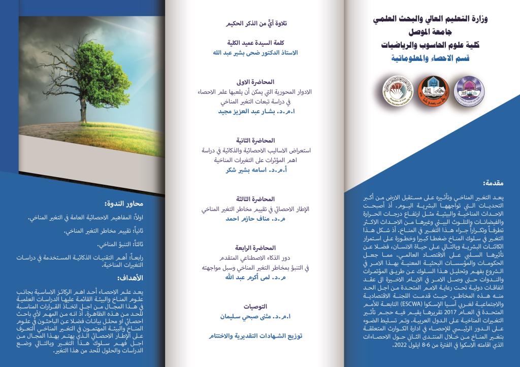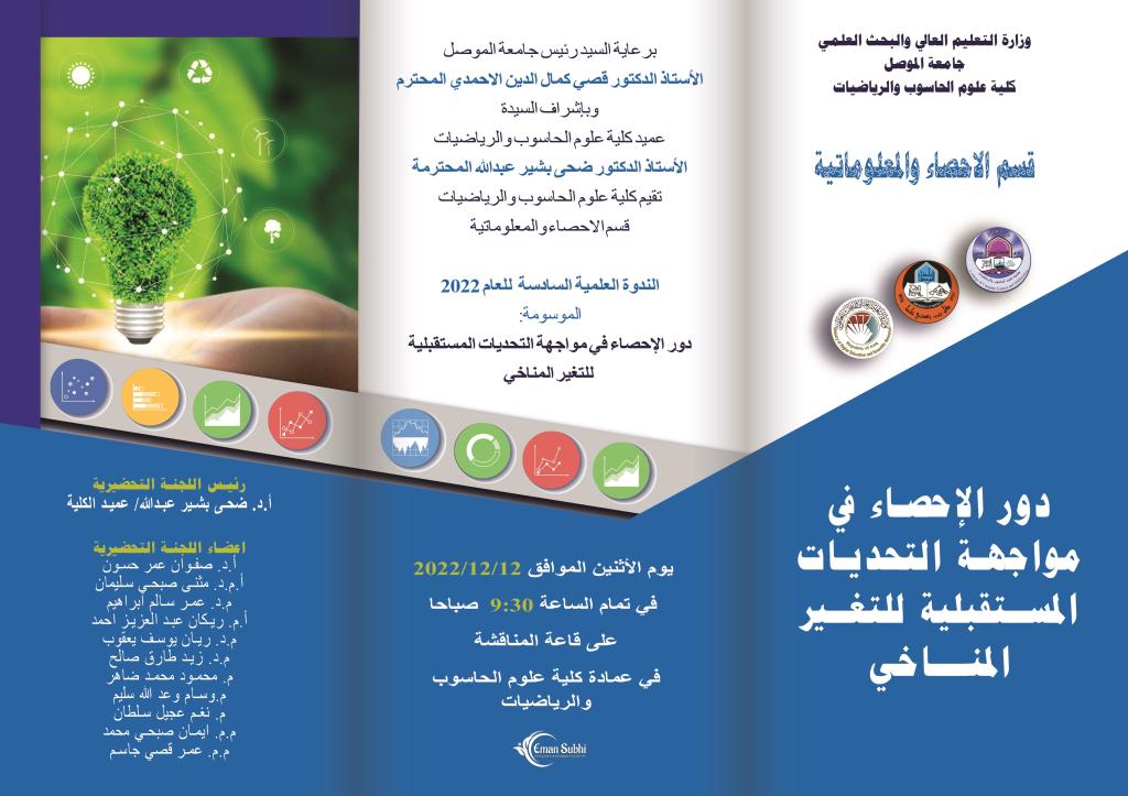 برعاية السيد رئيس جامعة الموصل الأستاذ الدكتور قصي كمال الدين الاحمدي المحترموبإشراف ومتابعة السيدة عميد كلية علوم الحاسوب والرياضيات الأستاذ الدكتور ضحی بشير عبدالله المحترمةتقيم كلية علوم الحاسوب والرياضيات – قسم الإحصاء والمعلوماتية الندوة العلمية السادسة للعام 2022 الموسومة:(دور الإحصاء في مواجهة التحديات المستقبلية للتغير المناخي)وذلك يوم الاثنين الموافق 12-12-2022 في تمام الساعة 9:30 صباحا وعلى قاعة المناقشة في عمادة كلية علوم الحاسوب والرياضياتوالدعوة عامة للجميعمقدمة يعد التغير المناخي وتأثيره على مستقبل الارض من أكبر التحديات التي تواجهها البشرية اليوم. أذ أصبحت الاحداث المناخية والبيئية مثل ارتفاع درجات الحرارة والفيضانات والتلوث البيئي وغيرها من الاحداث الاكثر تطرفاً وتكراراً جراء هذا التغير في المناخ. أذ شكل هذا التغير في سلوك المناخ ضغطا كبيرا وخطورة على استمرار الكائنات البشرية وبالتالي على حياة الانسان، فضلا عن تأثيرها السلبي على الاقتصاد العالمي. مما جعل الحكومات والمؤسسات البحثية المعنية بهذا الامر في الشروع بفهم وتحليل هذا السلوك عن طريق المؤتمرات والندوات حتى وصل الامر في الايام الاخيرة الى عقد اتفاقات دولية تحت رعاية الامم المتحدة من اجل الحد منه هذه المخاطر. حيث قدمت اللجنة الاقتصادية والاجتماعية لغربي آسيا الإسكوا (ESCWA) التابعة للأمم المتحدة في العام ٢٠١٧ تقريرها يقيم فيه حجم تأثير التغيرات المناخية على الدول العربية. وتم تسليط الضوء على الدور الرئيسي للإحصاء في ادارة الكوارث المتعلقة بتغير المناخ من خلال المنتدى الثاني حول الاحصاءات الذي اقامته الاسكوا في الفترة من6-8ايلول2022.محاور الندوة:اولاً: المفاهيم الاحصائية العامة في التغير المناخي.ثانياً: تقييم مخاطر التغير المناخي.ثالثاً: التنبؤ المناخي.رابعاً: أهم التقنيات الذكائية المستخدمة في دراسات التغيرات المناخية.الأهداف:يعد علم الاحصاء أحد اهم الركائز الاساسية بجانب علوم المناخ والبيئة القائمة عليها الدراسات العلمية في هذا المجال من اجل اتخاذ القرارات المناسبة للحد من هذه الظاهرة. أذ انه من المهم لأي باحث احصائي او محلل بيانات فضلا عن الباحثون في علوم المناخ والبيئة المهتمون في التغير المناخي التعرف على الإطار الاحصائي الذي يهتم بهذا المجال من اجل فهم سلوك هذا التغير وبالتالي وضع الدراسات والحلول للحد من هذا التغير.