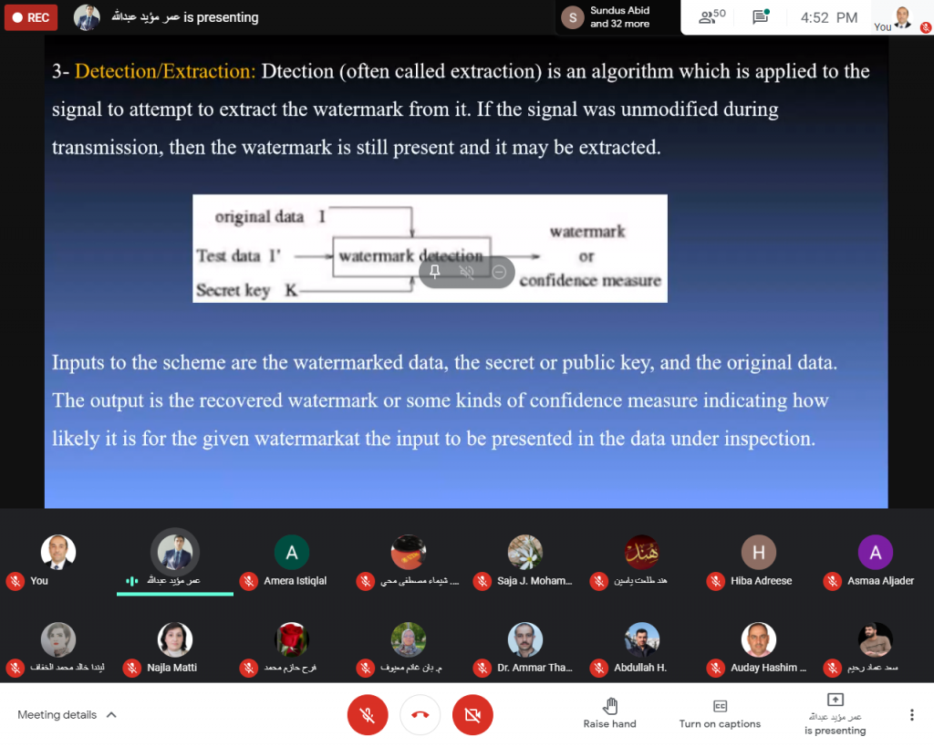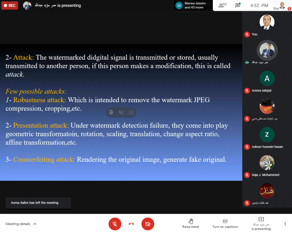 وبإشراف السيدة عميد كلية علوم الحاسوب والرياضيات الأستاذ الدكتور ضحى بشير عبد الله المحترمةاقامت كلية علوم الحاسوب والرياضيات – قسم علوم الحاسوبالورشة العلمية الإلكترونية السادسة للعام 2021 الموسومة:”Interactive Multimedia Content Security: Concepts and Requirements”, عبر الفضاء الإلكتروني يوم الأثنين 3-5-2021 ,الساعة الرابعة عصرا.هدفت هذه الورشة العلمية الى شرح مفهوم الوسائط المتعددة التفاعلية وانواعها وأمنية هذه الوسائط من خلال شرح المتطلبات وانواع الآليات والتطبيقات المستخدمة لتنفيذها على هذه الوسائط, ومن خلال المحورين :١. مفهوم محتوى الوسائط المتعددة التفاعلية ومتطلباتها وانواعها ومقارنتها بالغير تفاعلية.
