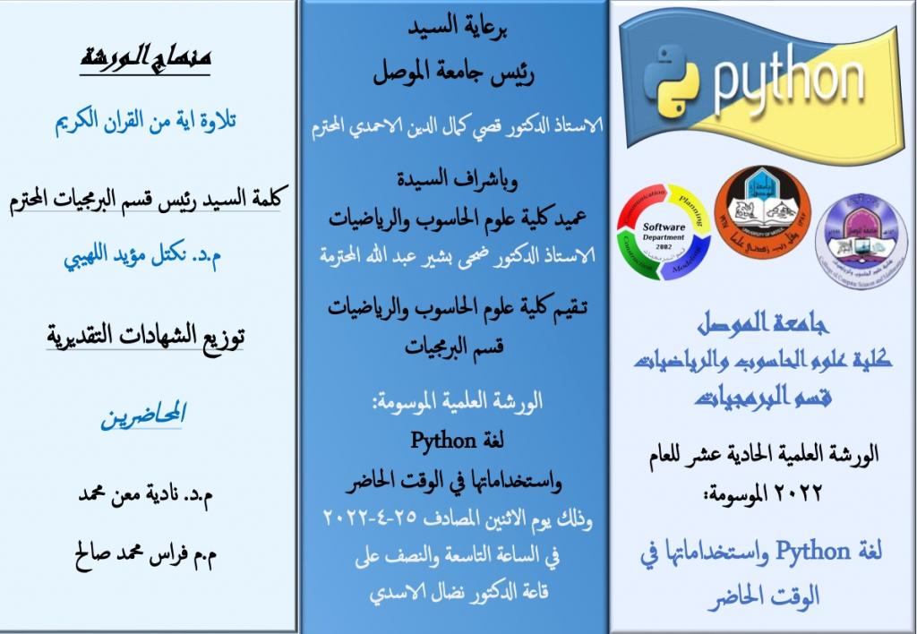 وبإشراف السيدة عميد كلية علوم الحاسوب والرياضيات الأستاذ الدكتور ضحى بشير عبدالله المحترمةتقيم كلية علوم الحاسوب والرياضيات – قسم البرمجيات الورشة العلمية الحادية عشرة للعام 2021-2021 الموسومة:(لغة Python واستخداماتها في الوقت الحاضر )وذلك في تمام الساعة التاسعة والنصف من صباح من يوم الاثنين المصادف 25-4-2022 وعلى قاعة الدكتور نضال الاسدي .والدعوة عامة للجميع..