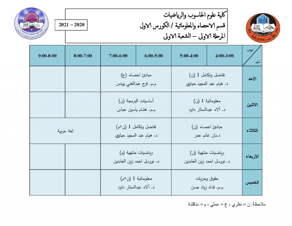 جداول المحاضرات-المرحلة الأولى – قسم الاحصاء والمعلوماتية
