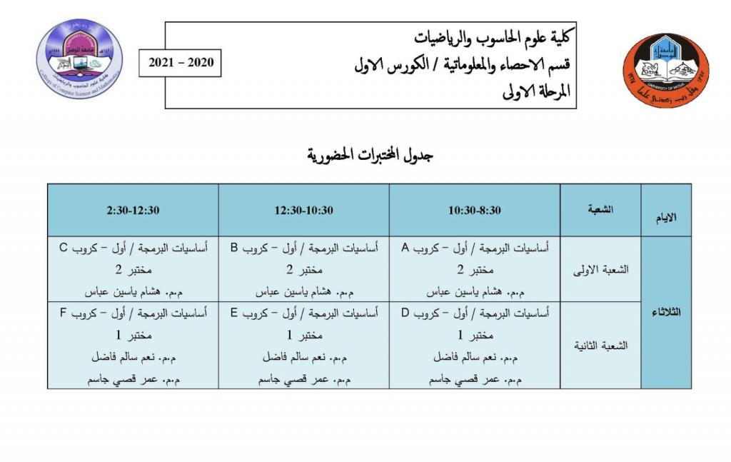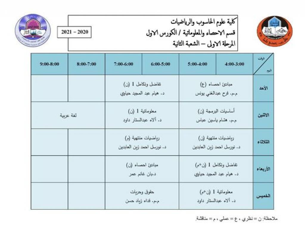 الى طلبتنا الأعزاء في المرحلة الأولى – قسم الاحصاء والمعلوماتيةنعلن لكم جداول المحاضرات النظرية الالكترونية وكذلك جدول العملي الحضوري في مختبرات القسم مع التاكيد على التقيد والالتزام بشروط الوقاية والسلامة.