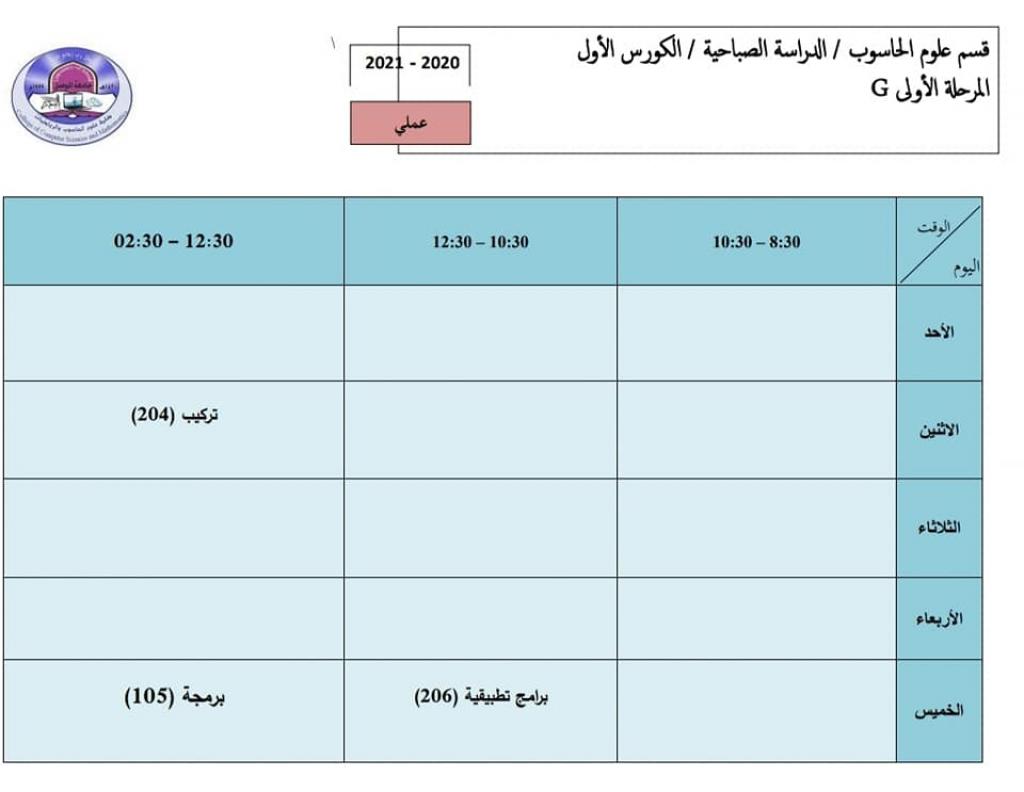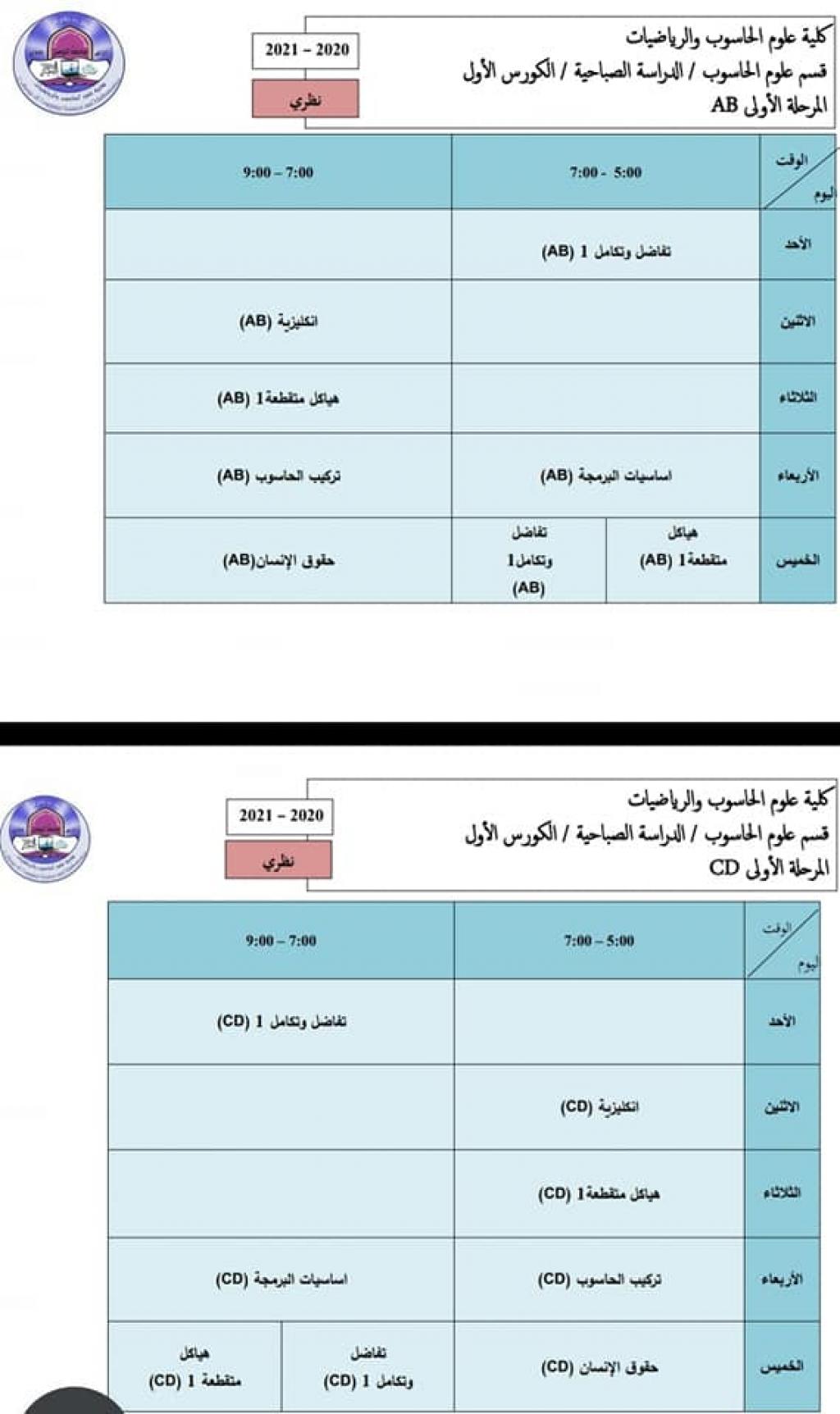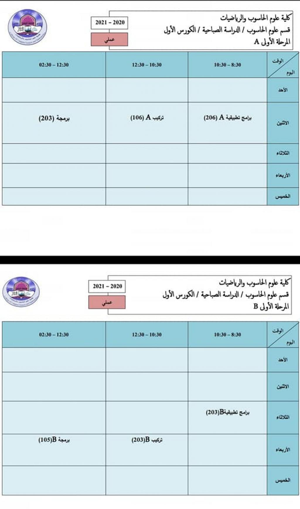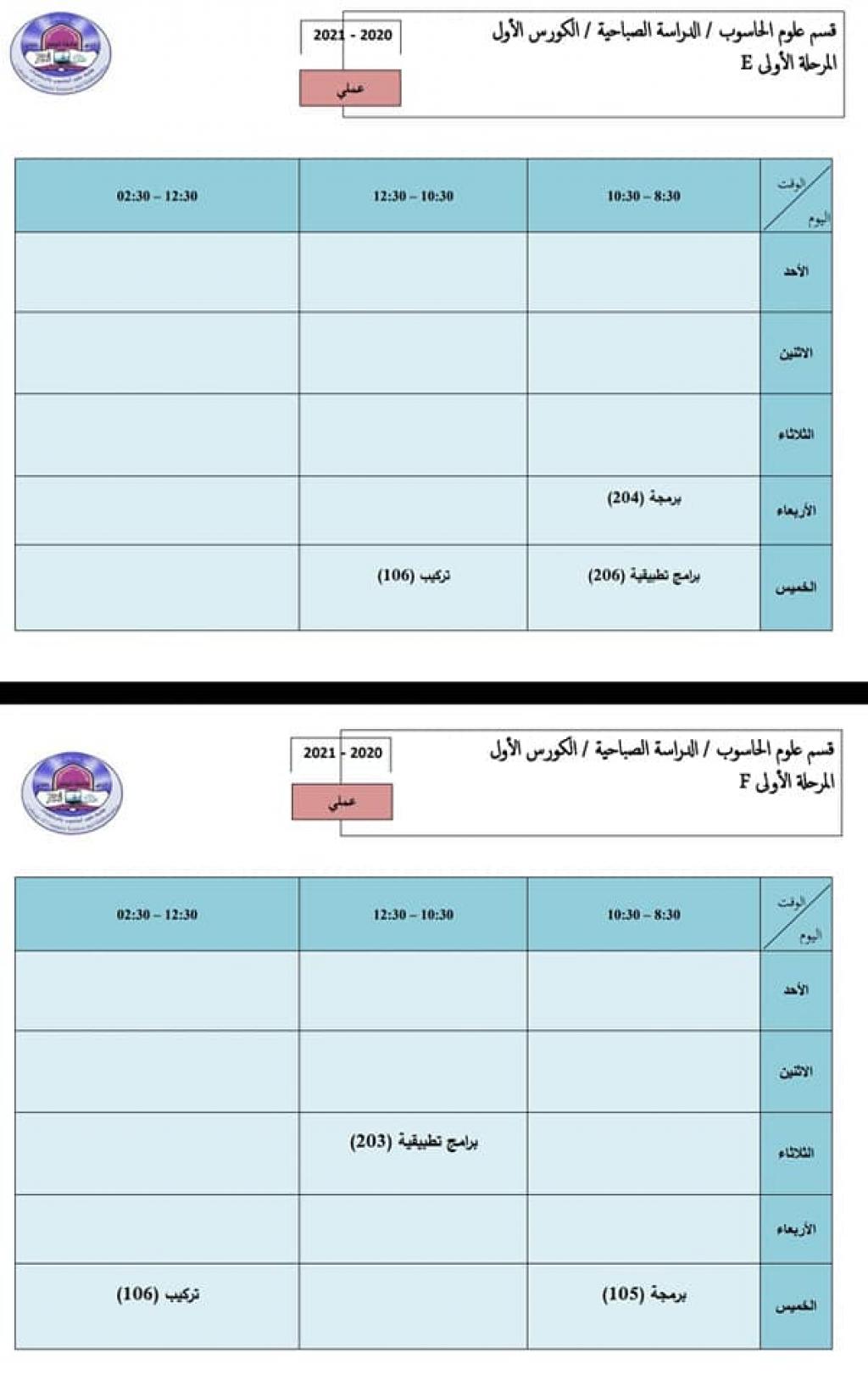 جداول المحاضرات-المرحلة الأولى – قسم علوم الحاسوب