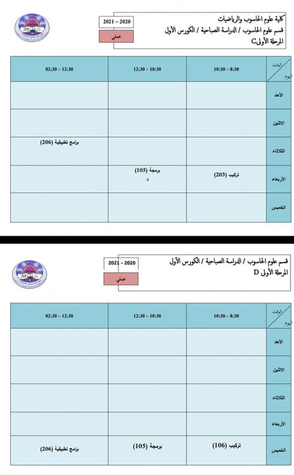 الى طلبتنا الأعزاء في المرحلة الأولى – قسم علوم الحاسوبنعلن لكم جداول المحاضرات النظرية الالكترونية وكذلك جداول العملي الحضوري في مختبرات القسم مع التاكيد على التقيد والالتزام بشروط الوقاية والسلامة.