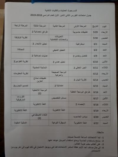 جدول الامتحانات النهائية لقسم بحوث العمليات والتقنيات الذكائية للعام الدراسي 2018-2019 مع تمنياتنا للجميع بالتوفيق والنجاح.