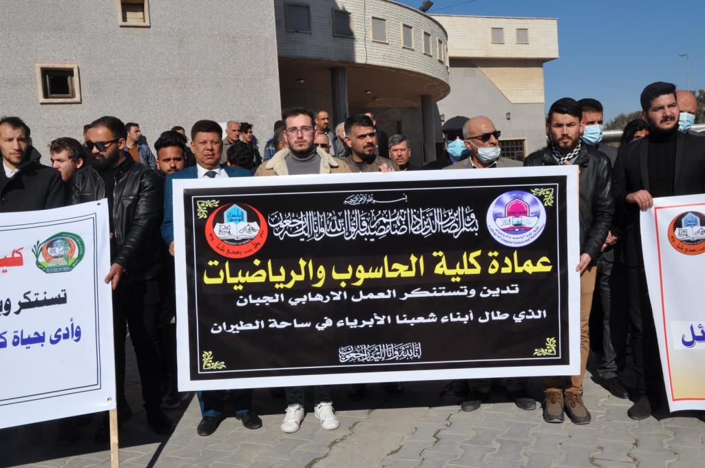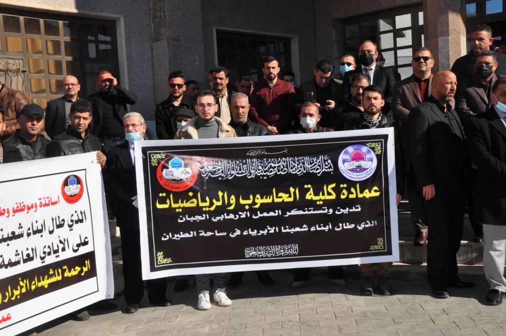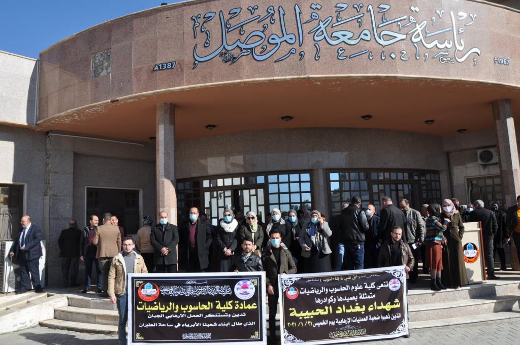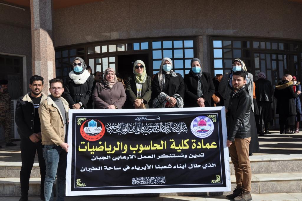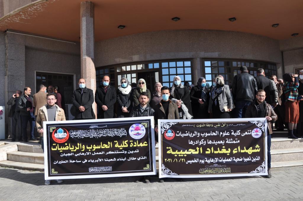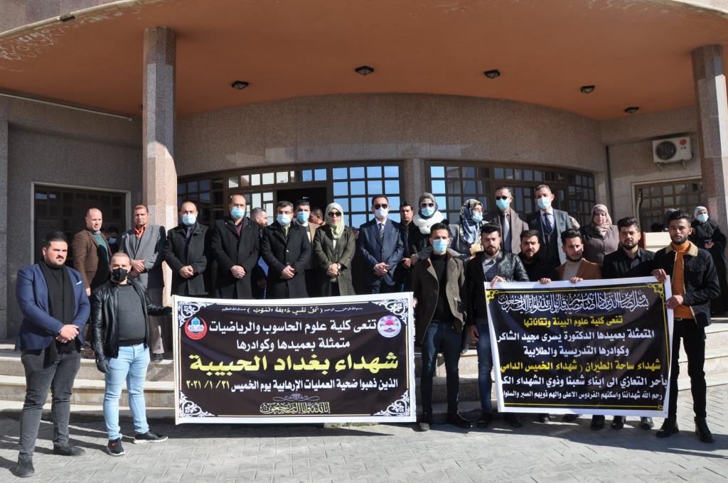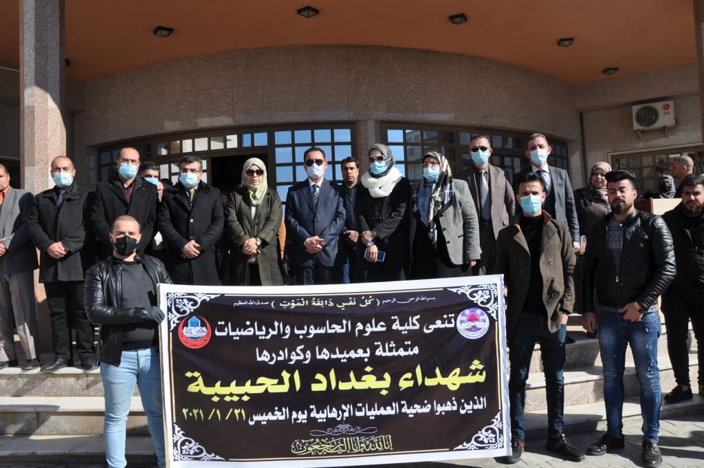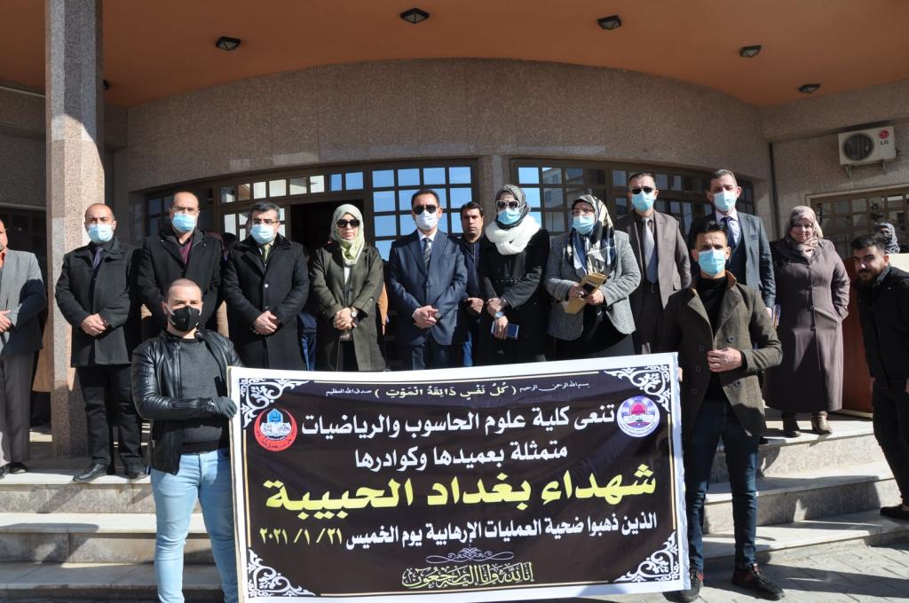 بجباهٍ يعلوها الخجل..وبصوتِ ضميرٍ بالدماءِ اكتحل..ادى اليوم منتسبو كلية علوم الحاسوب والرياضيات وبحضور السيدة عميد الكلية الاستاذ الدكتور ضحى بشير عبد الله المحترمة صلاة الغائب على ارواح شهداء ساحة الطيران في بغداد الحبيبة الذين سقطوا ظلما وغدرا في حادث يعيد الى الاذهان شريط التفجيرات الدامية..لقد سبق القدر بأن ارض العراق لا تروى الا بدماء ابنائه الاخيار..فلكم سالت دماء طاهرة..كانت ازكى من العطور الفاخرة.. روت ارض العراق..اننا اليوم اذا نواسي ونحزن. ونعتد.. نعلم يقينا، ان الجرح لدى صاحبه.. اكبر واشد..فما لنا الا ان نقف بحزنٍ وصمت مبتهلين الى الله سبحانه وتعالى ان يرحم شهدائنا وان يصبر قلوب اهليهم.. اباءا واطفالا.. فمصاب الفقد مصابٌ جلل، إلا ان عزائنا وعزاء محبيهم أن يرزقهم الله منازل الشهداء..واخيرا نقول، إن الارهاب وإن أخذ منا ما أخذ من صاحبٍ وحبيب..إلا ان عهد الوفاء للعراق باق.. وفاءا ومحبة متجذرة في الاعماق..فسلاما سلاما ارض العراق..