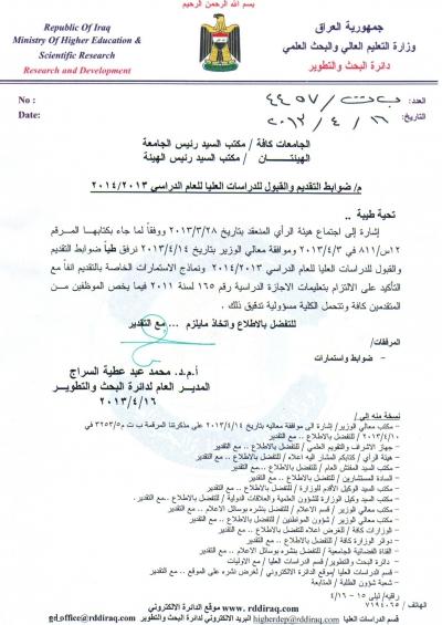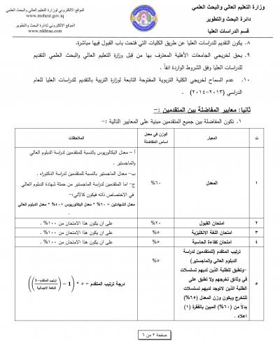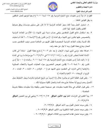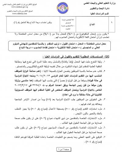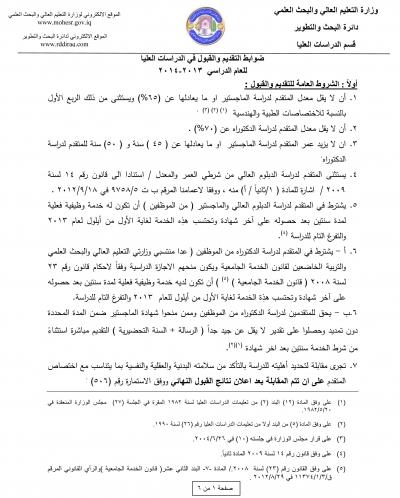 ضوابط التقديم والقبول في الدراسات العليا للعام الدراسي 2014/2013