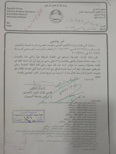 عودة الطلبة المرقنة قيودهم للدراسات العليا على قناة النفقة الخاصة وعلى الموظفين منهم جلب اجازة دراسية جديدة تتوافق مع المدة الدراسية التي تحددها الكلية وفق تعليمات الاجازة الدراسية خلال مدة 60 يوم من تاريخ اصدار الامر الجامعي بالعودة