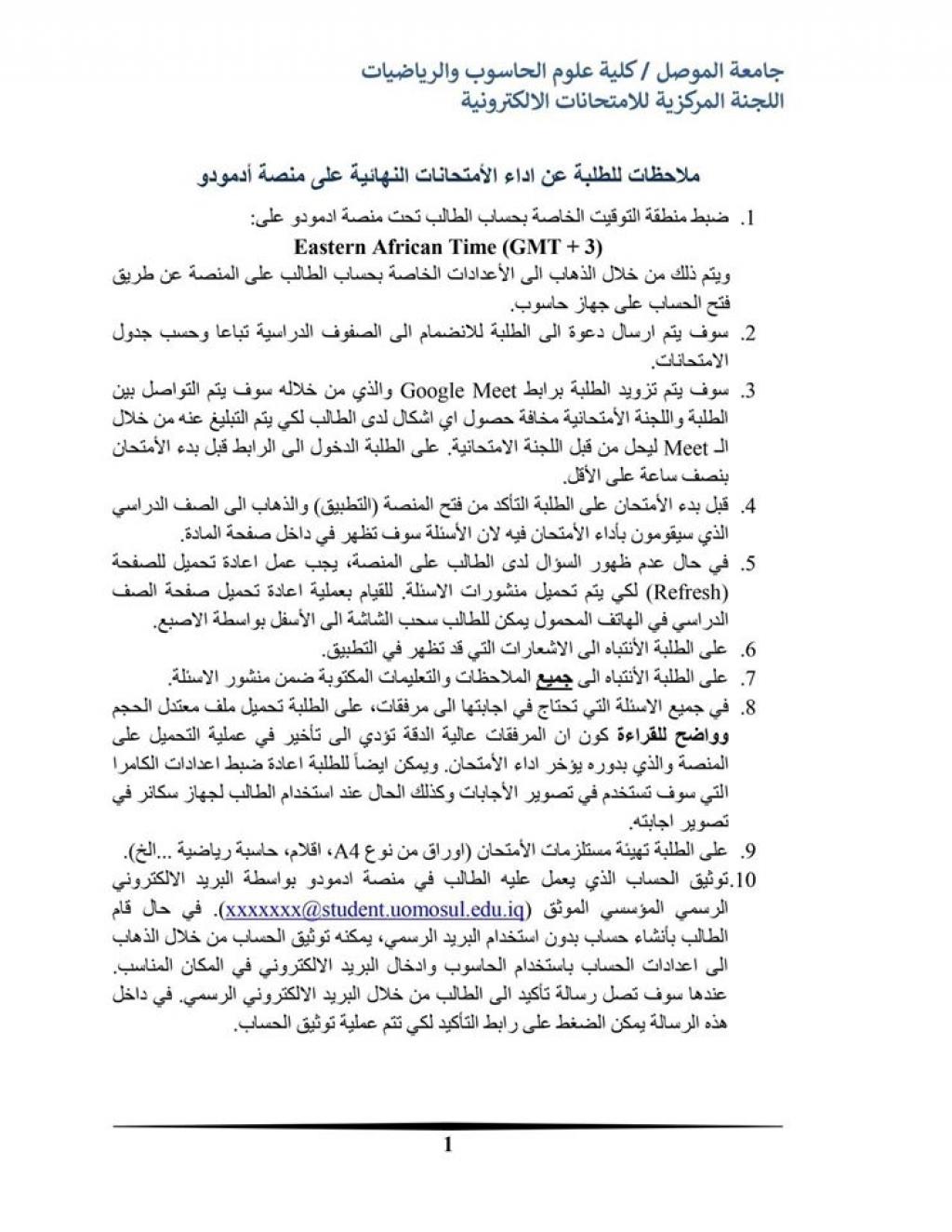حرصا من عمادة الكلية والمتمثلة بالسيدة عميد الكلية الأستاذ الدكتور ضحى بشير عبدالله المحترمة على ابناءنا الطلبة لكي يتم اداءهم الامتحان ودخولهم للمنصة بشكل صحيح ويسيير نعرض لكم بعض الملاحظات والتي تم فيها توضيح كل الأمور التي سيحتاجها طلبتنا الأعزاء في اداء امتحانهم الإلكتروني متمنين لهم الموفقية والنجاح وهم يخوضون التجربة الاولى في الامتحانات الالكترونية داعمين لهم ومذللين جميع الصعوبات.