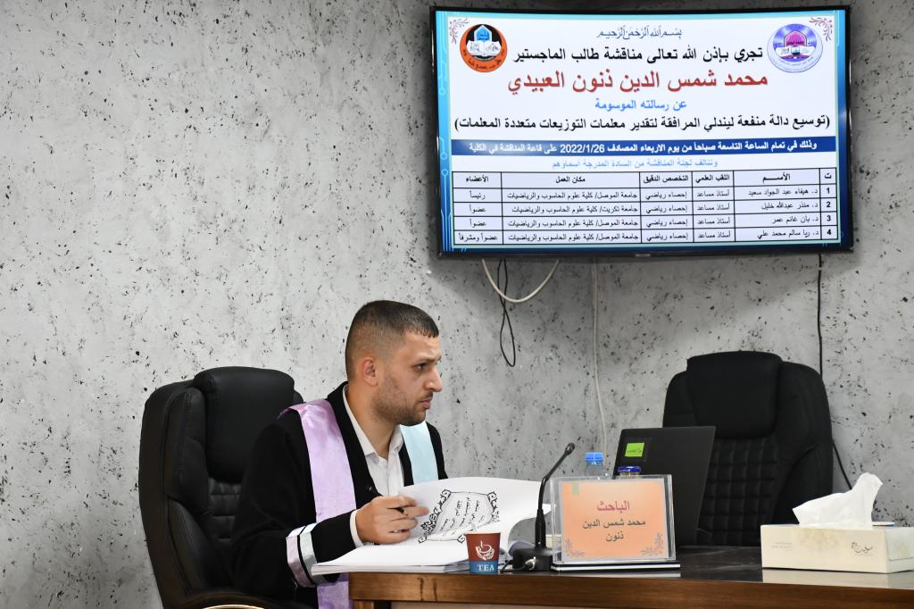 مناقشة رسالة ماجستير في كلية علوم الحاسوب والرياضيات – قسم الإحصاء والمعلوماتية بعنوان (توسيع دالة منفعة ليندلي المرافقة لتقدير معلمات التوزيعات متعدد المعلمات)