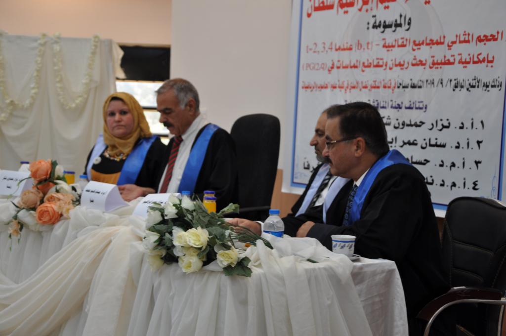 تمت مناقشة طالبة الماجستير شيماء حليم ابراهيم سلطان قسم الرياضيات لرسالتها الموسومة (الحجم المثالي للمجاميع القالبية {b,t} عندما t=2,3,4 باكانية تطبيق بحث ريمان وتقاطع المماسات في PG(2,q)) يوم الاثنين المصادف 2/9/2019 وعلى قاعة المناقشة في الكلية علما ان الرسالة مكتوبة باللغة العربية وتتكون لجنة المناقشة من الذوات المدرجة اسمائهم ادناهد. نزار حمدون شكر استاذ رئيساد. سنان عمر ابراهيم استاذ عضواد. حسام قاسم محمد استاذ مساعد عضواد. ندى ياسين قاسم استاذ مساعد عضوا ومشرفا