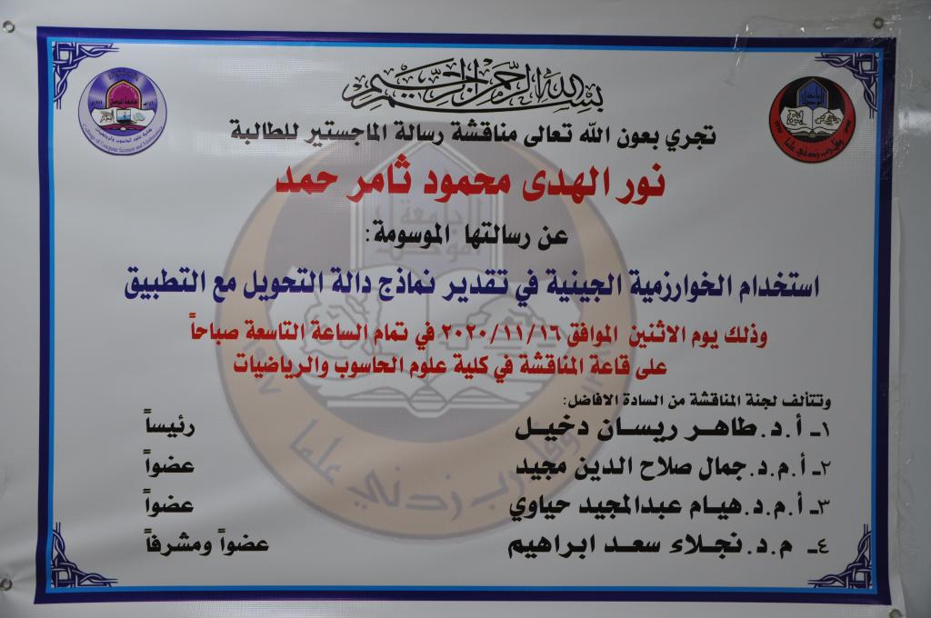 استمرار لحركة البحث العلمي وبحضور ومتابعة السيدة عميد الكلية الأستاذ الدكتورة ضحى بشير عبدالله المحترمة.نوقشت بكلية علوم الحاسوب والرياضيات في جامعة الموصل رسالة الماجستير الموسومة “استخدام الخوارزمية الجينية في تقدير نماذج دالة التحويل مع التطبيق” للطالبة نور الهدى محمود ثامر باشراف المدرس الدكتورة نجلاء سعد ابراهيم يوم الاثنين الموافق ٢٠٢٠/١١/١٦وتالفت لجنة المناقشة من الاستاذ الدكتور طاهر ريسان دخيل ( رئيسا) وعضوية كل من الاستاذ المساعد الدكتور جمال صلاح الدين مجيد والاستاذ المساعد الدكتورة هيام عبد المجيد حياوي.وتناولت هذه الدراسة احد نماذج دالة التحويل التي تتضمن ثلاث سلاسل زمنية وهي: سلسلتان غير مستقلتان كمدخلات وسلسلة واحدة كمخرج. ولقد تم إجراء دراسة مكثفة لخصائص نماذج السلاسل الزمنية متعددة المتغيرات باستخدام إنموذج دالة التحويل وأقتراح استخدام الخوارزمية الجينية لتقدير المعلمات النهائية للنماذج المدروسة وذلك لسرعتها في الوصول إلى إيجاد الحل الأمثل.وتهدف هذه الرسالة إلى معرفة نماذج دالة التحویل وكیفیة بناء النماذج ومعرفة كفاءة النماذج في التنبؤ بالمعدلات الشهرية لدرجات الحرارة في محافظة نينوى.قد حصلت الطالبة على شهادة الماجستير في علوم الإحصاء