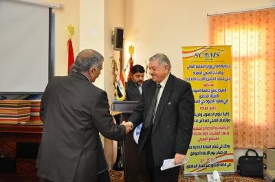 منح الاستاذ الدكتور نزار حمدون شكر عميد كلية علوم الحاسوب والرياضيات شهادة تقديرية الى الاستاذ الدكتور موفق محمد القصاب رئيس اللجنة العلمية في انجاح اعمال المؤتمر العلمي السادس المقام في الكلية
