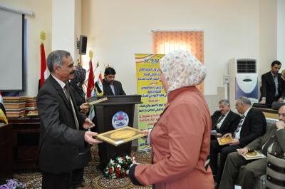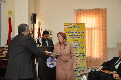 منح الاستاذ الدكتور نزار حمدون شكر عميد كلية علوم الحاسوب والرياضيات شهادة تقديرية الى الدكتورة هيام عبد المجيد حياوي عضو اللجنة العلمية في انجاح اعمال المؤتمر العلمي السادس المقام في الكلية