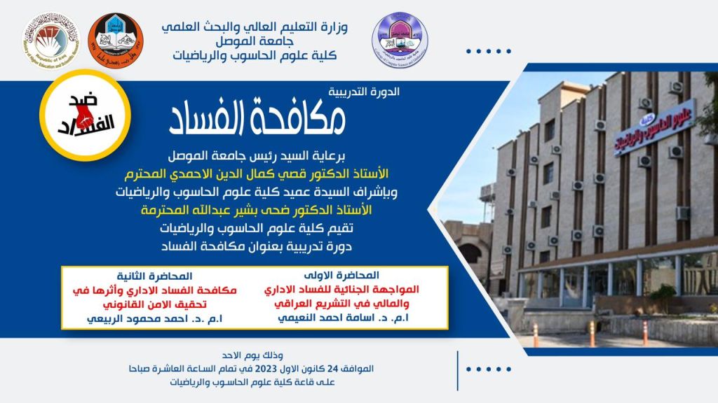 برعاية السيد رئيس جامعة الموصل الاستاذ الدكتور (قصي كمال الدين الأحمدي) وبأشراف السيدة عميد الكلية الأستاذ الدكتور (ضحى بشير عبد الله) تقيم كلية علوم الحاسوب والرياضيات قسم علوم الحاسوب ورشة علمية والموسومة بعنوان ” حوكمة الانترنيت ” وذلك في يوم الاحد الموافق 24- 12- 2023 وستقام أعمال الورشة في قاعة الفضاء الالكتروني وفي تمام الساعة الثانية عشر والدعوة عامة .