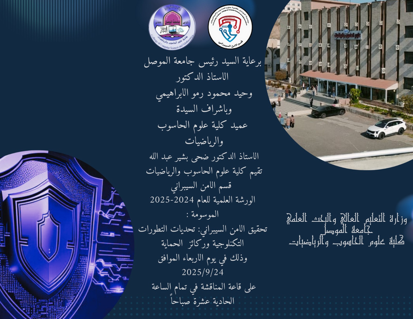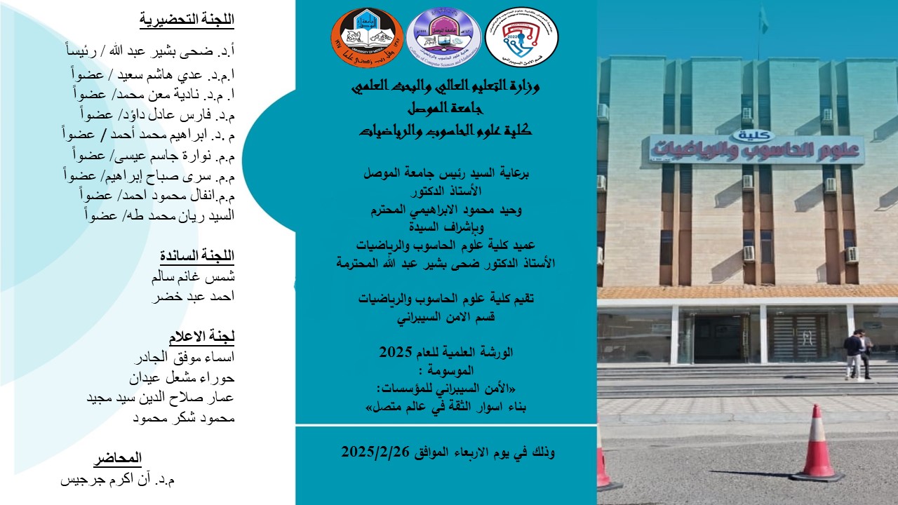 أمن نفسك برعاية السيد رئيس جامعة الموصل الاستاذ الدكتور وحيد محمود الابراهيمي وباشراف السيدة عميد كلية علوم الحاسوب والرياضيات الأستاذ الدكتور ضحى بشير عبدالله البزاز [إقرأ المزيد]