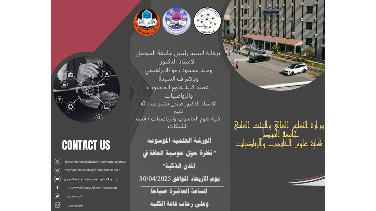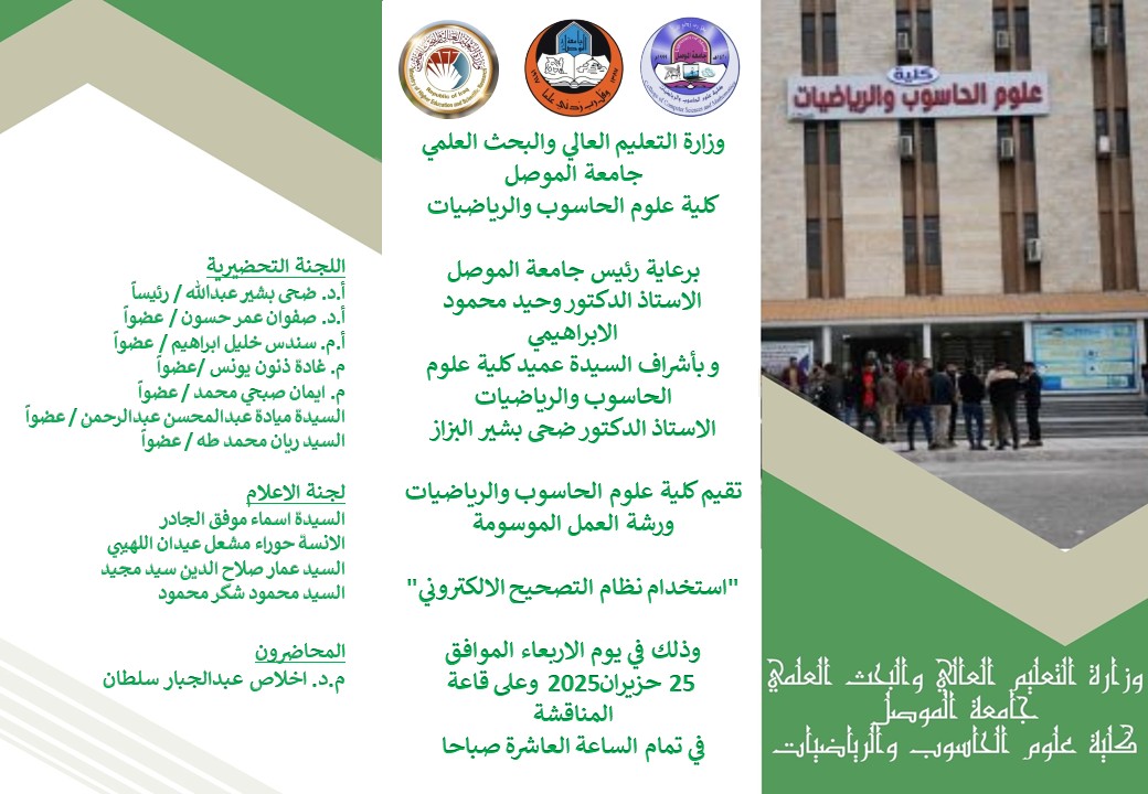 برعاية السيد رئيس جامعة الموصل الاستاذ الدكتور وحيد محمود الابراهيمي المحترم ووبدعم ومتابعة السيدة عميد كلية علوم الحاسوب والرياضيات الأستاذ الدكتور ضحى بشير عبدالله المحترمة [إقرأ المزيد]