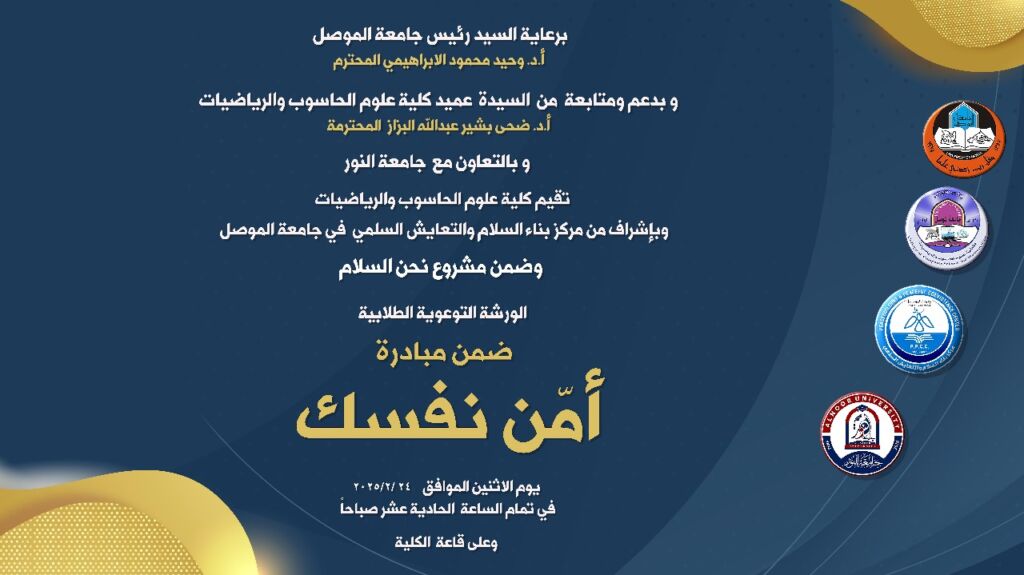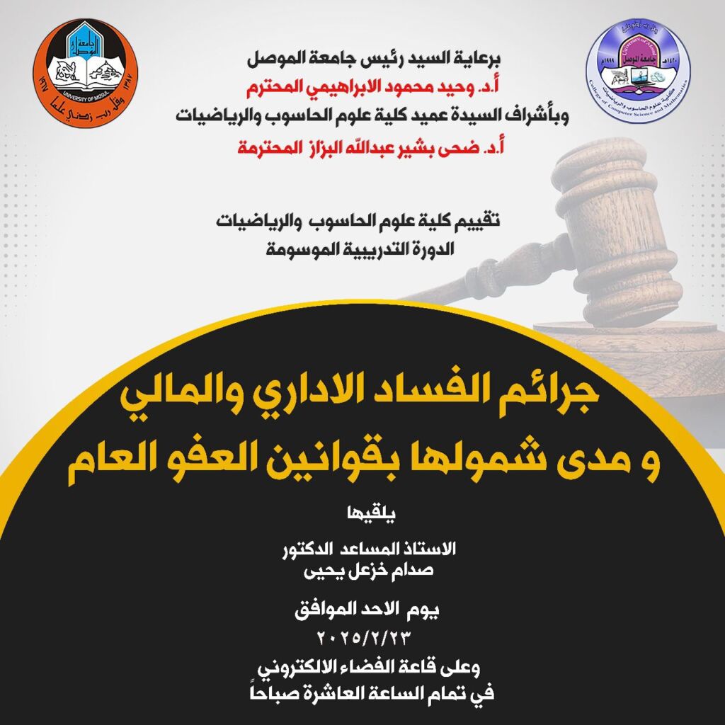 برعاية واشراف السيدة عميد كلية علوم الحاسوب والرياضيات الأستاذ الدكتور ضحى بشير عبدالله المحترمة وضمن سلسلة النشاطات العلمية للكلية, اقامت كلية علوم الحاسوب والرياضيات دورة تدريبية بعنوان “جرائم الفساد الاداري والمالي ومدى شمولها بقوانين العفو العام ” والتي القاها الاستاذ المساعد الدكتور صدام خزعل يحيى يوم الاحد 23-2-2025 وعلى رحاب قاعة الفضاء الالكتروني.