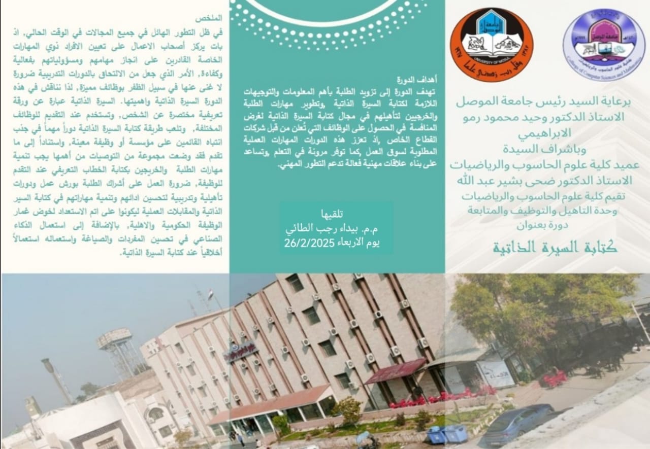تقيم كلية علوم الحاسوب والرياضيات / وحدة التاهيل والتوظيف والمتابعة الدورة الموسومة: كتابة السيرة الذاتية يوم الاربعاء 26/2/2025 والدعوة عامة