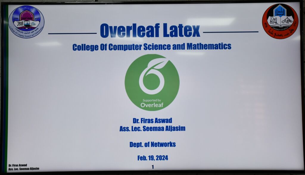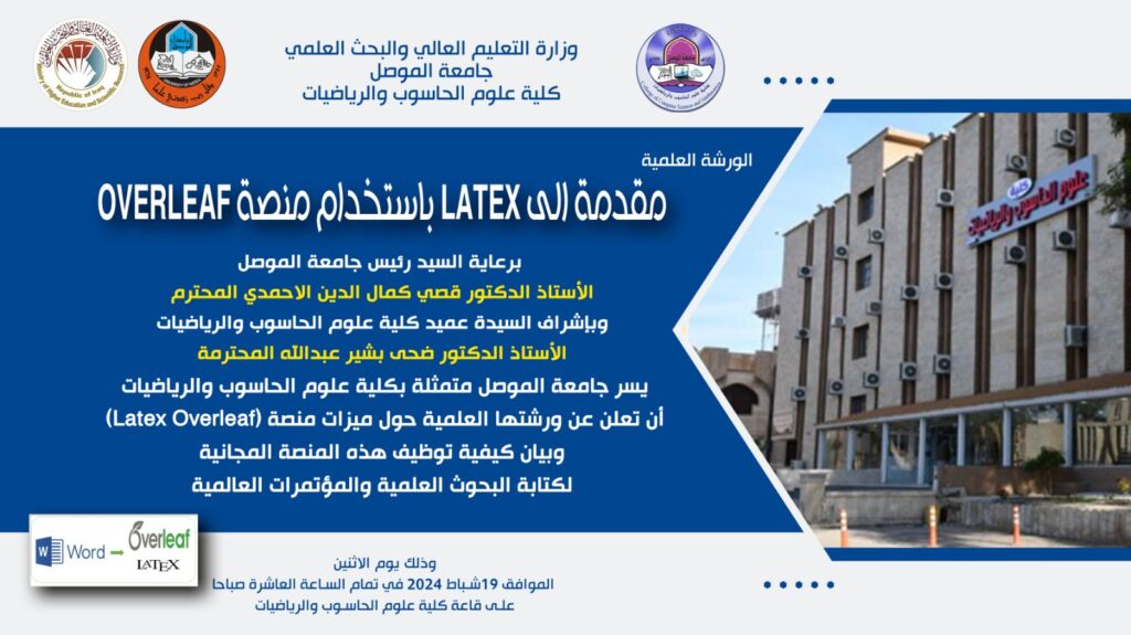 اقامت كلية علوم الحاسوب والرياضيات الورشة (مقدمة الى latex باستخدام منصة overleaf) تاريخ انعقادها (19 شباط 2024) وتناولت (كيفية كتابة البحث العملي باستخدام لايتك وافر ليف )