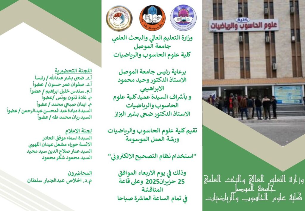 برعاية السيد رئيس جامعة الموصل الاستاذ الدكتور (وحيد محمود رمو الابراهيمي) وبأشراف السيدة عميد الكلية الأستاذ الدكتور (ضحى بشير عبد الله) تقيم كلية علوم الحاسوب والرياضيات ورشة علمية بعنوان “استخدام نظام التصحيح الالكتروني” ” يوم الاربعاء 25-6-2025 والدعوة عامة