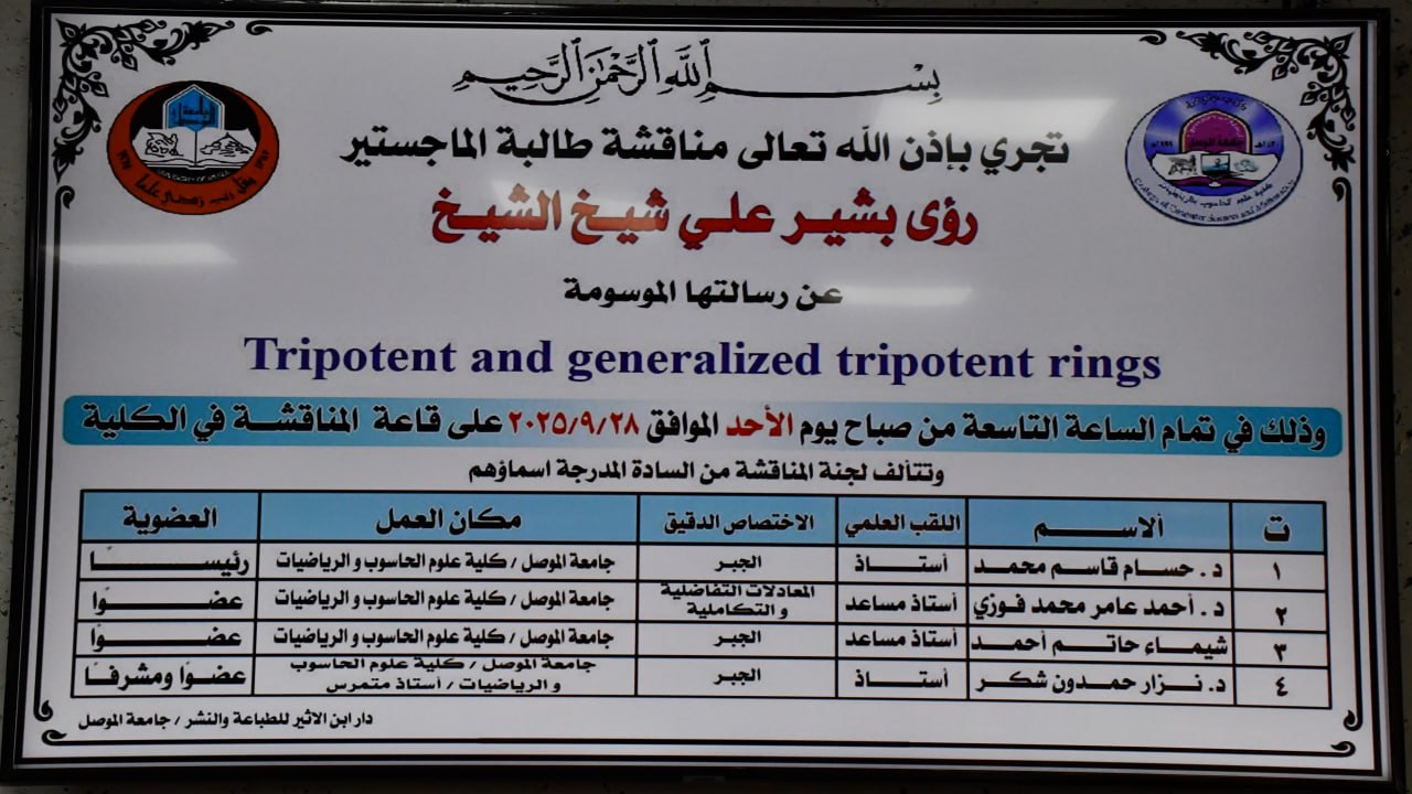 نوقشت في قاعة المناقشة بكلية علوم الحاسوب والرياضيات في جامعة الموصل يوم الاحد الموافق 28-9-2025